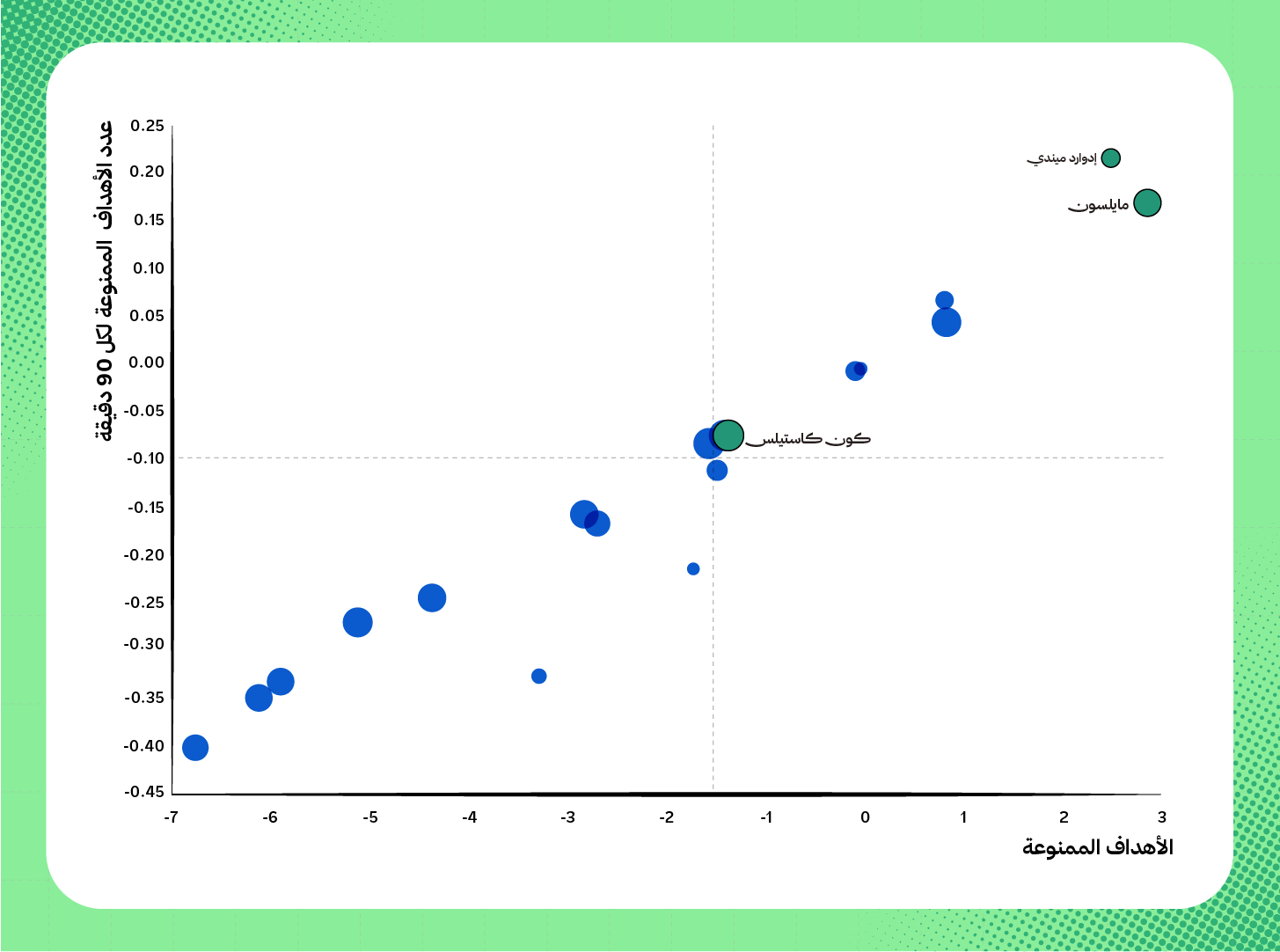 ولكن عندما ننظر لإحصائية منع الأهداف سنجد تفوقًا واضحًا للثنائي إدوارد ميندي ومايلسون على كاستيلس، إذ منع مايلسون (2.86 هدفًا في 1440 دقيقة لعب)، ومنع ميندي (2.49 هدفًا في 900 دقيقة لعب). في حين جاء رقم كاستيلس بالسالب (-1.38 هدف في 1505 دقيقة لعب) بمعنى أنه فشل في منع عدد أكبر من الأهداف.