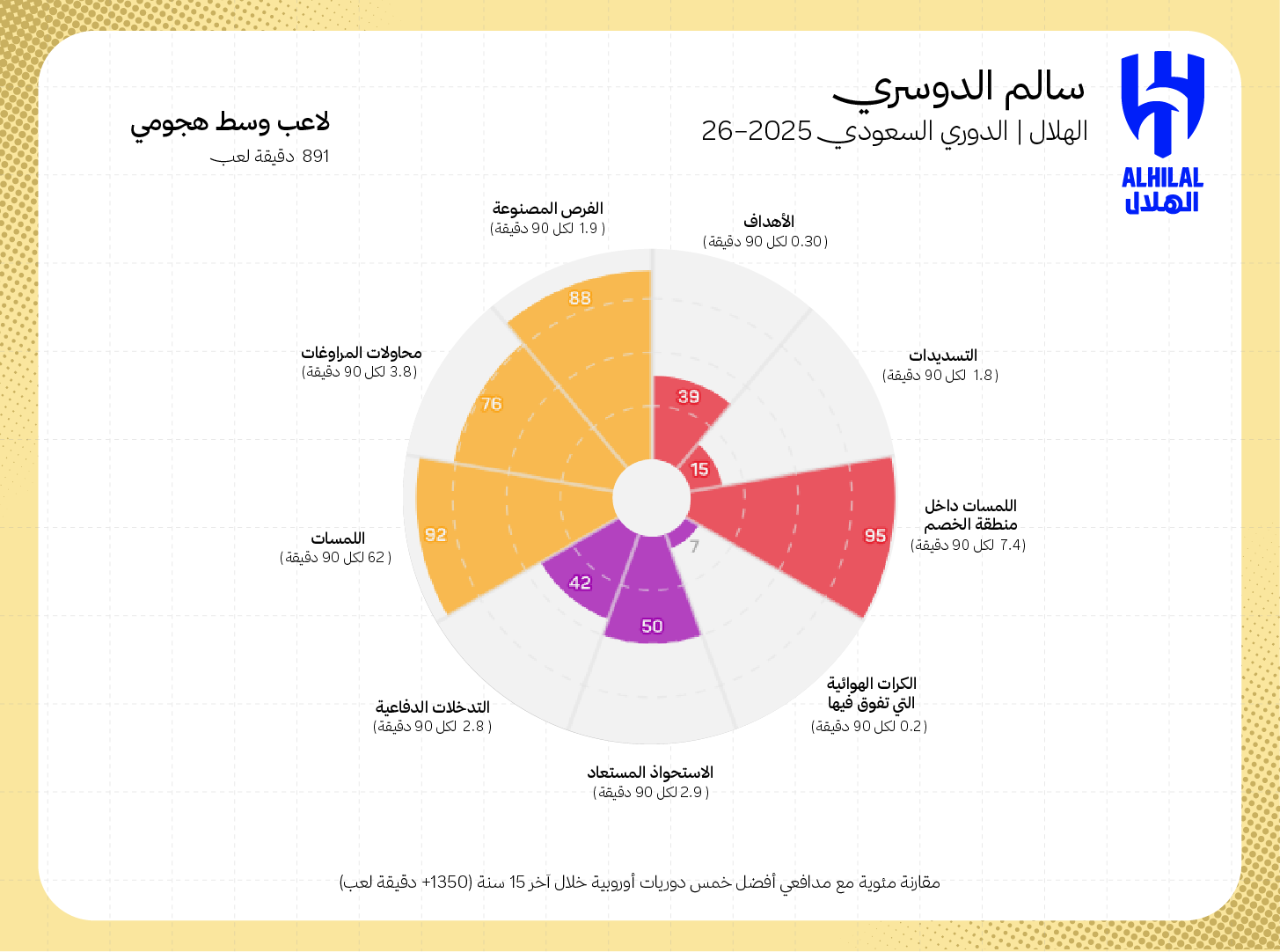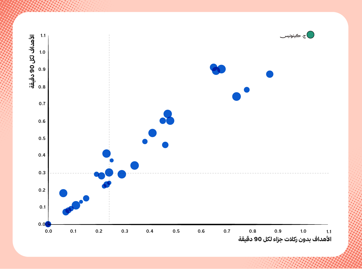 لو قلتُ إن البيانات سهّلت لي الكثير من الخيارات السابقة، لكنها عجزت عن إبراز مهاجمين سعوديين على درجة عالية من الكفاءة، بالنظر لأن السواد الأعظم منهم لا يلعب بصفةٍ أساسية. في حين أن لاعبًا مثل فراس البريكان مهاجم المنتخب يلعب مع الأهلي بأدوار مختلفة تبعده عن صفة المهاجم أو رأس الحربة الصريح.