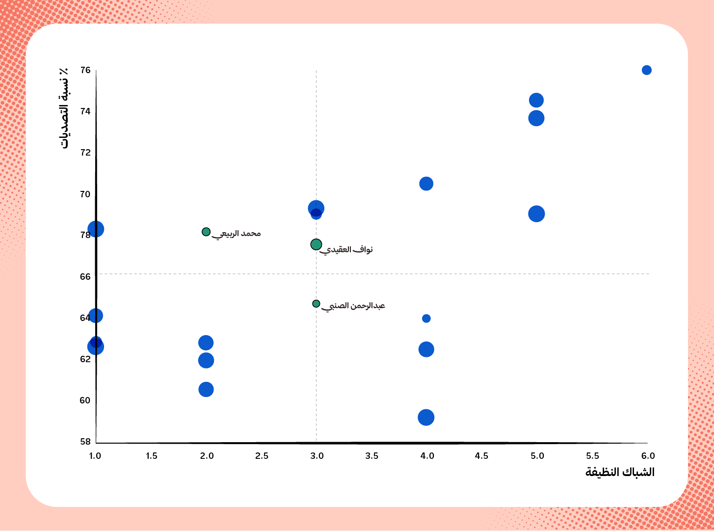 يتفوق نواف العقيدي في عدد التصديات بـ 25 تصديًا، مقابل 13 تصديًا لمحمد اليامي، و11 تصديًا لعبدالرحمن الصانبي.