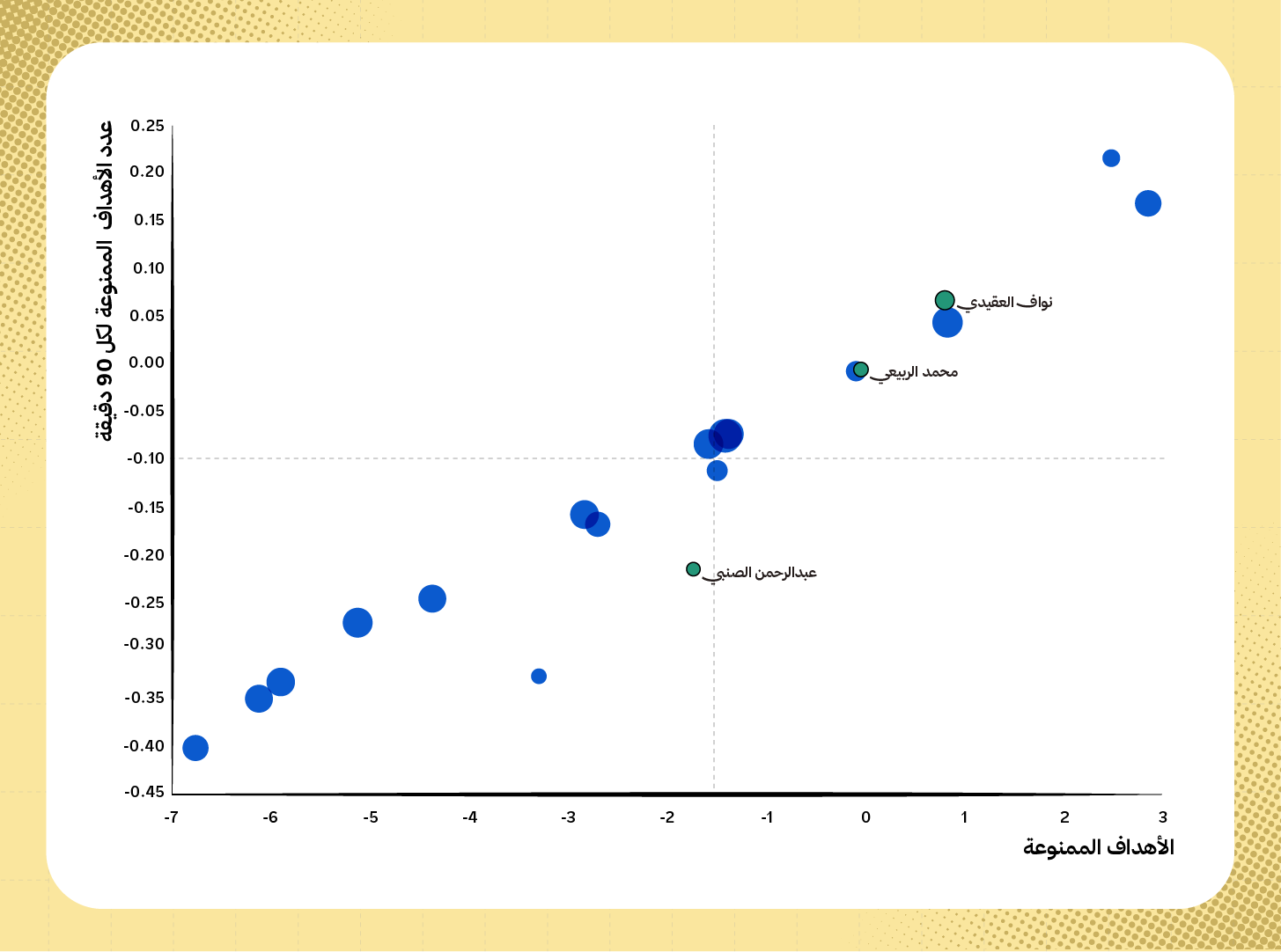 ولكن، يتفوق نواف العقيدي بشكلٍ واضح في منع الأهداف حيث استطاع منع (0.81 هدفًا)، مقابل (-0.04 هدفًا) لمحمد اليامي، و(-1.73 هدفًا) لعبدالرحمن الصانبي. بمعنى أن الثنائي فشلا في منع عدد أكبر من الأهداف.