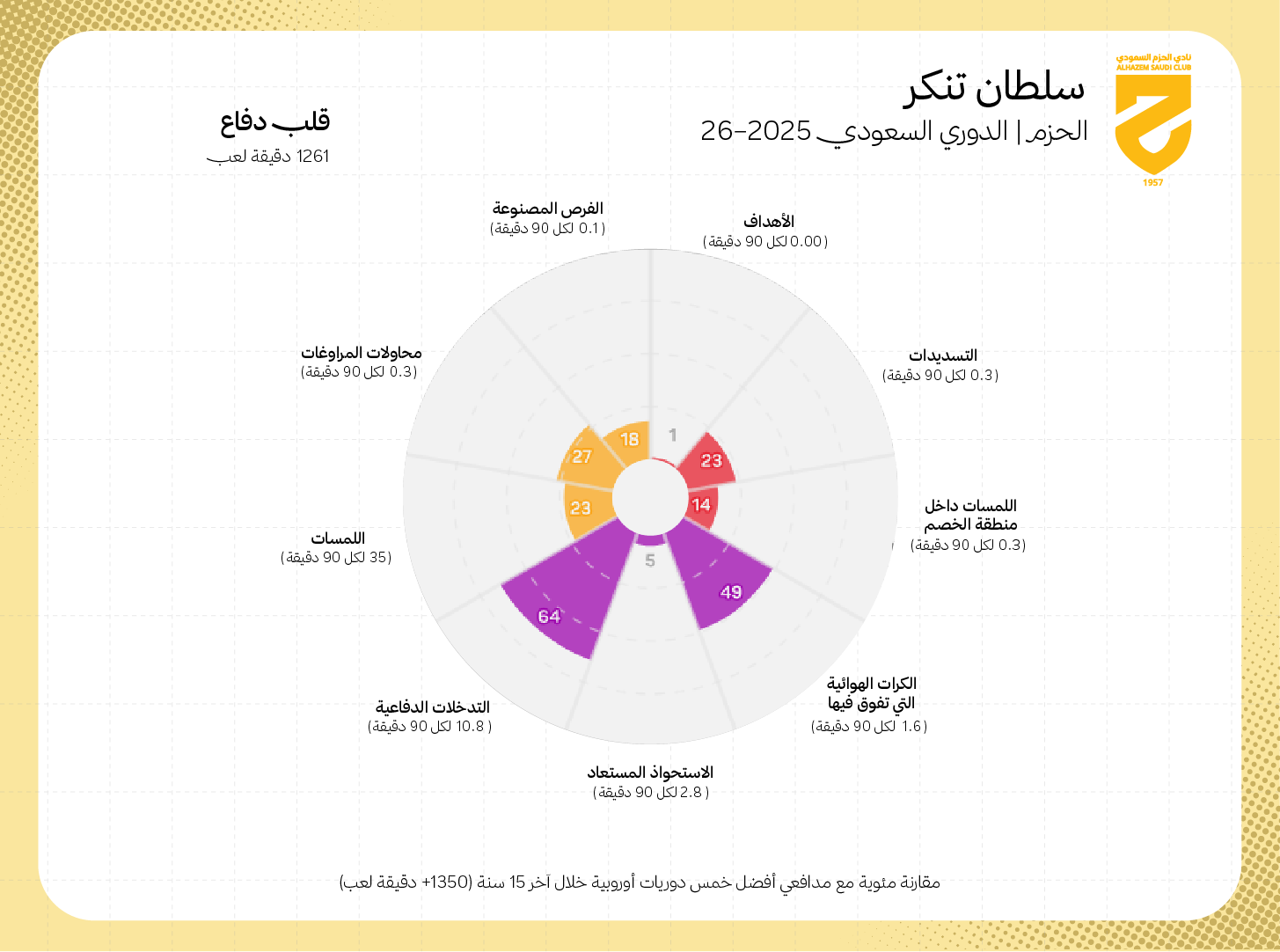 كما يبرز اسم سلطان تنكر مدافع الحزم في الإحصائيات، مع حسان تمبكتي بأنه قلب دفاع سعودي.