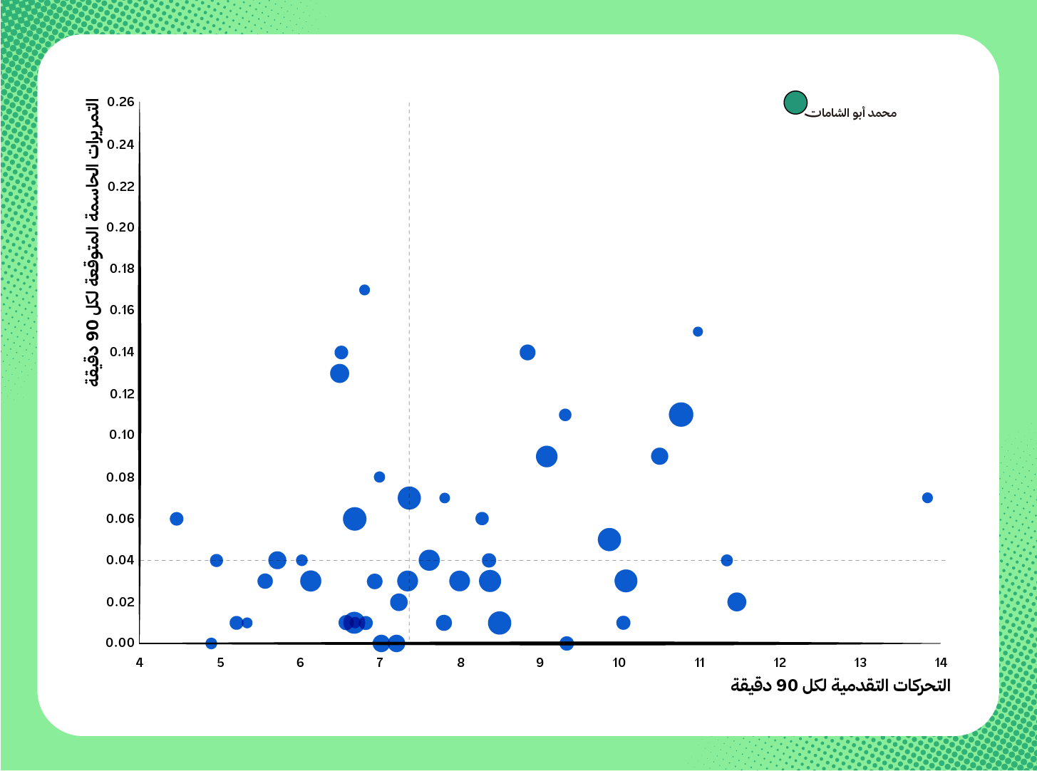 يبرز اسم محمد أبو الشامات كثالث أعلى لاعبي الدوري في معدل التمريرات المتوقعة من اللعب المفتوح (5.5 تمريرةً)، ورابع أعلى اللاعبين في الكرات العرضية الصحيحة (بمعدل 0.71)، وخامس أعلى اللاعبين في المراوغات الناجحة (بمعدل 1.68). إضافةً إلى كونه الأعلى في مركزه (بمعدل العمل الهجومي 12.2)، والأعلى خلقًا للفرص بـ 26 فرصةً صنع منها (5 أهداف).