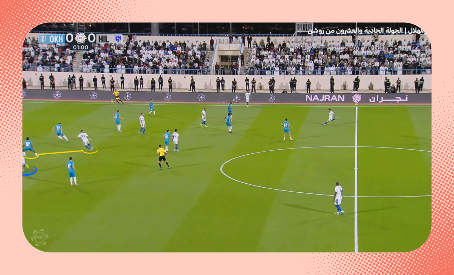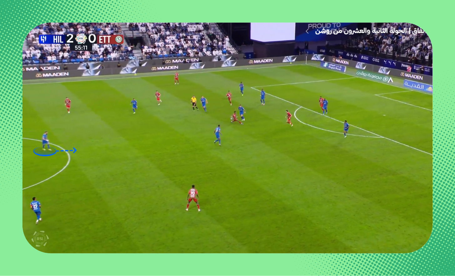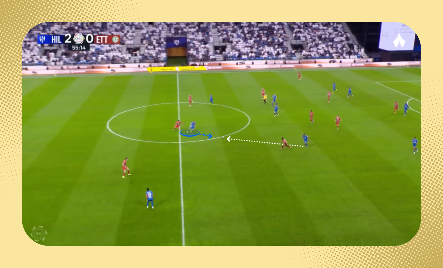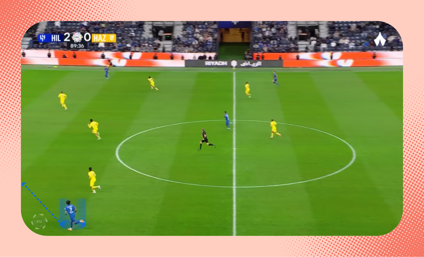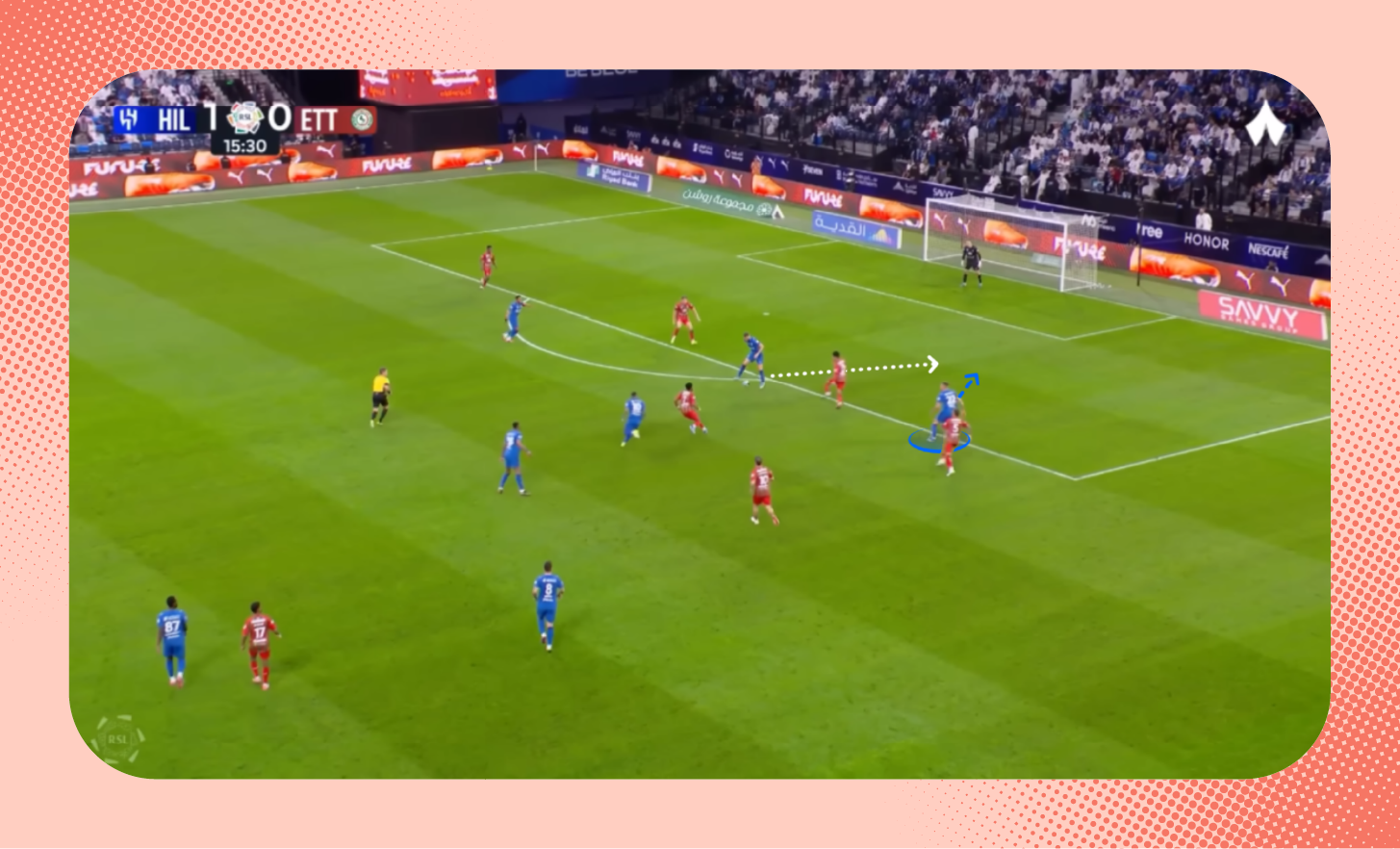 في هذه اللقطة من مباراة الرياض، يُمكنك ملاحظة التفوق العددي للاعبي الهلال على الأطراف، الذي مكّن الفريق من إحداث ثغرة في أنصاف المساحات، تحرك بها ثيو.