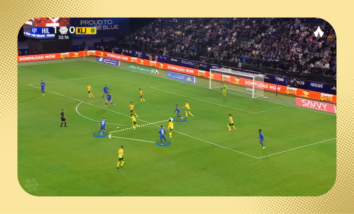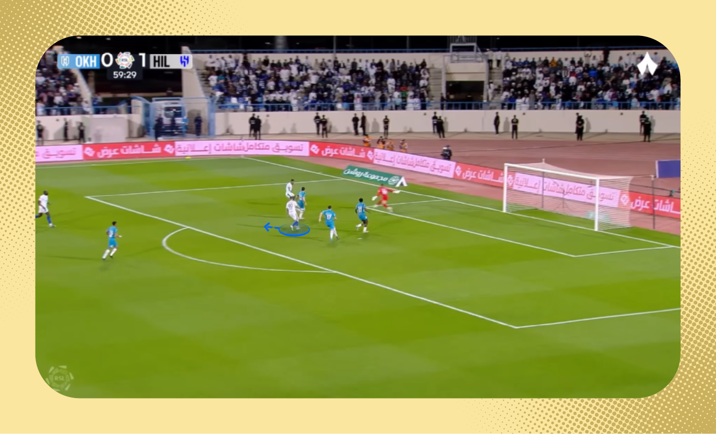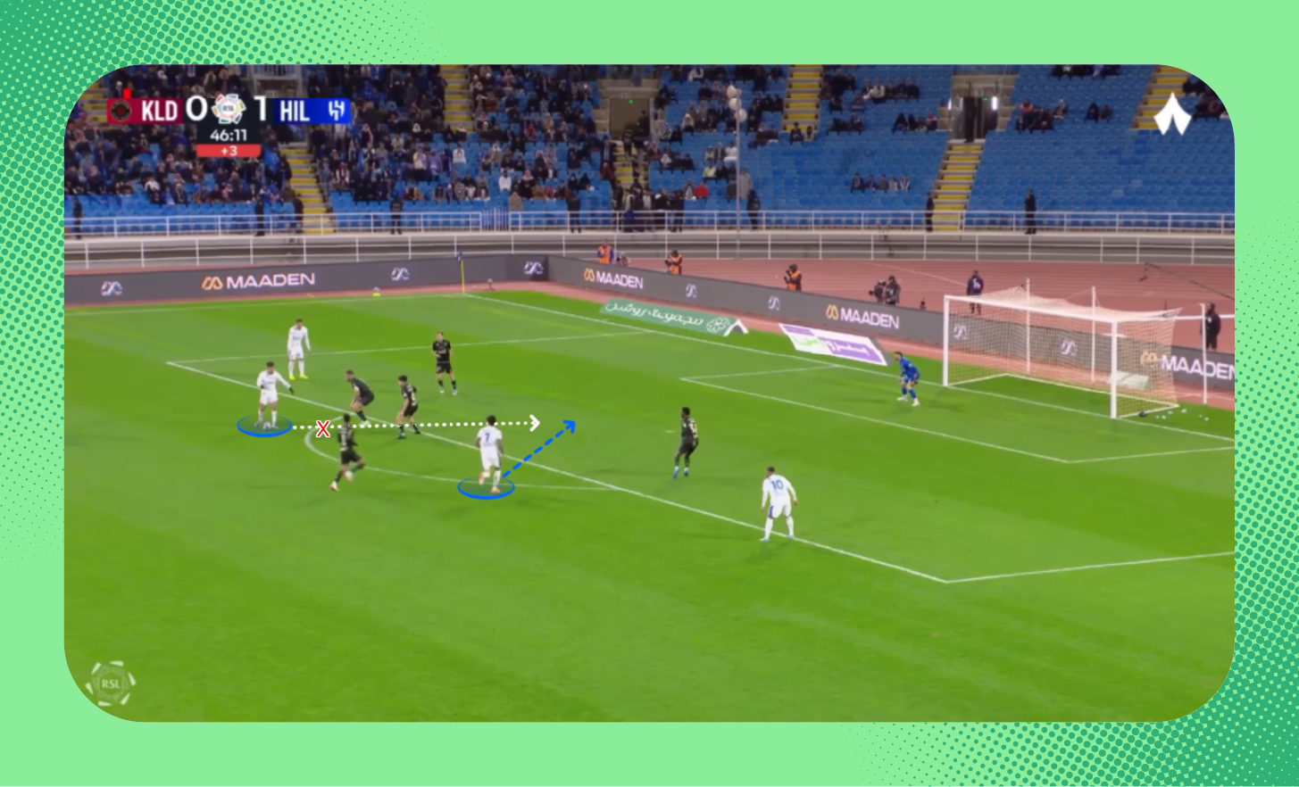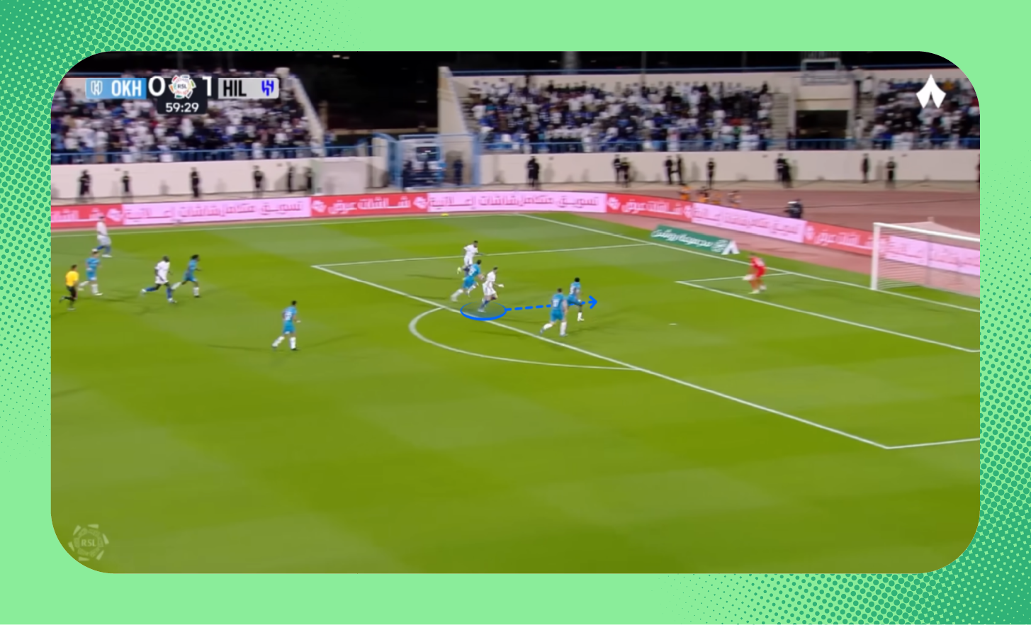 في هذه اللقطة من مباراة الرياض، يُمكنك ملاحظة التفوق العددي للاعبي الهلال على الأطراف، الذي مكّن الفريق من إحداث ثغرة في أنصاف المساحات، تحرك بها ثيو.