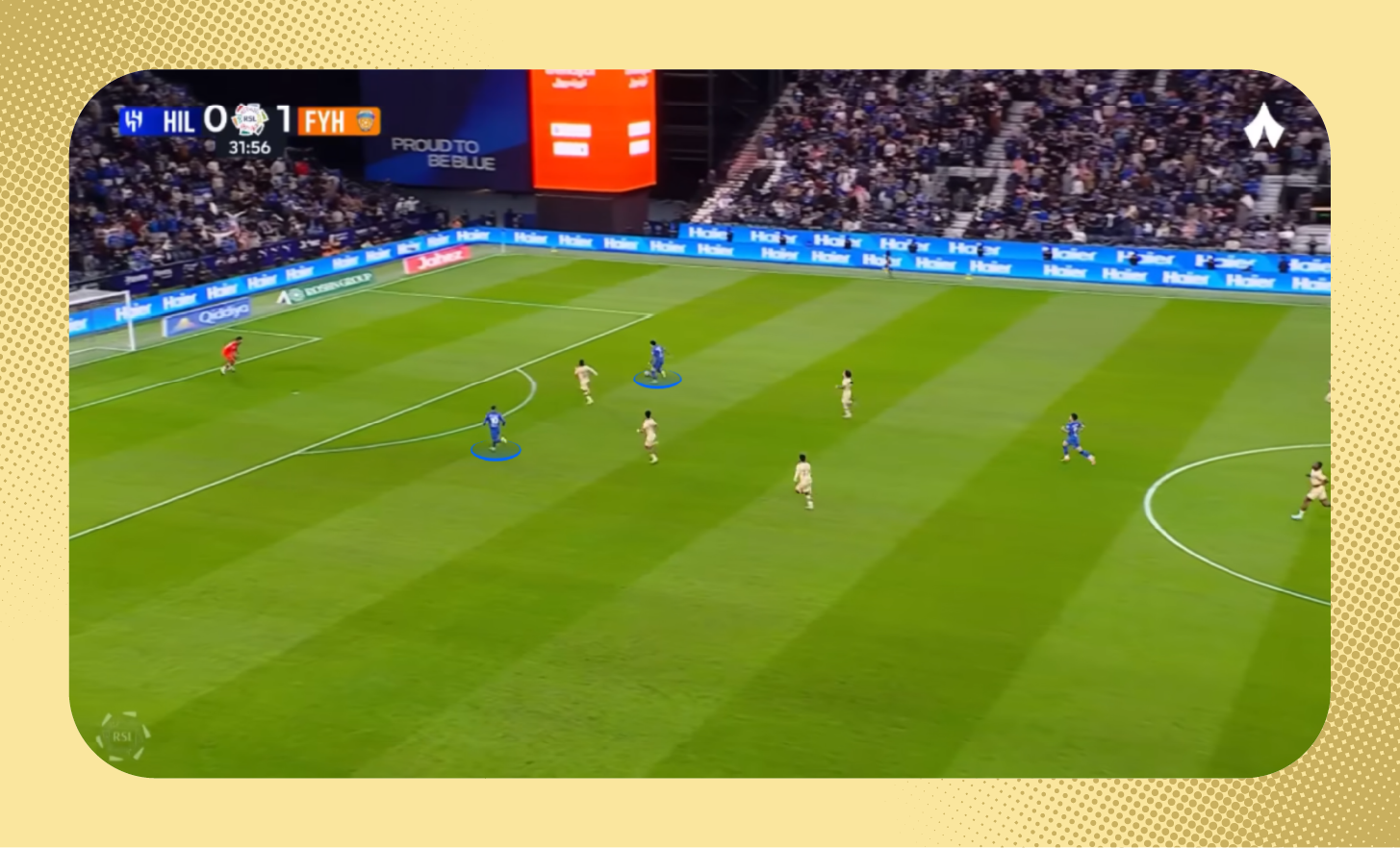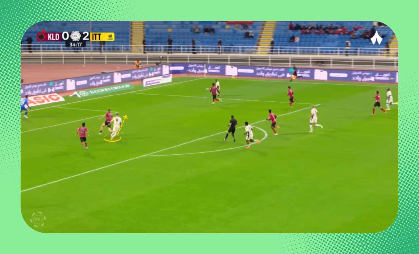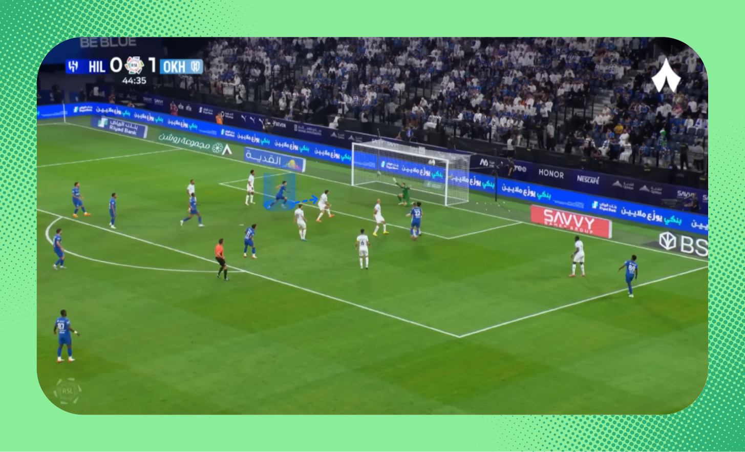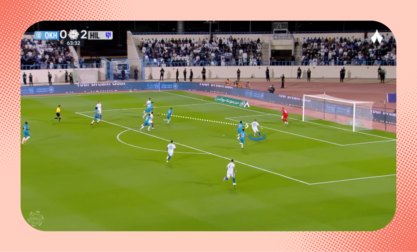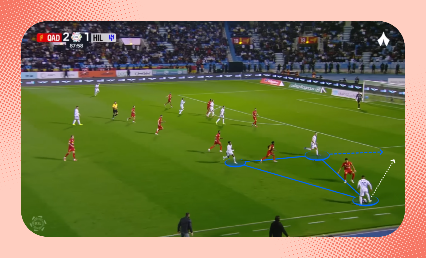 في هذه اللقطة من مباراة الرياض، يُمكنك ملاحظة التفوق العددي للاعبي الهلال على الأطراف، الذي مكّن الفريق من إحداث ثغرة في أنصاف المساحات، تحرك بها ثيو.