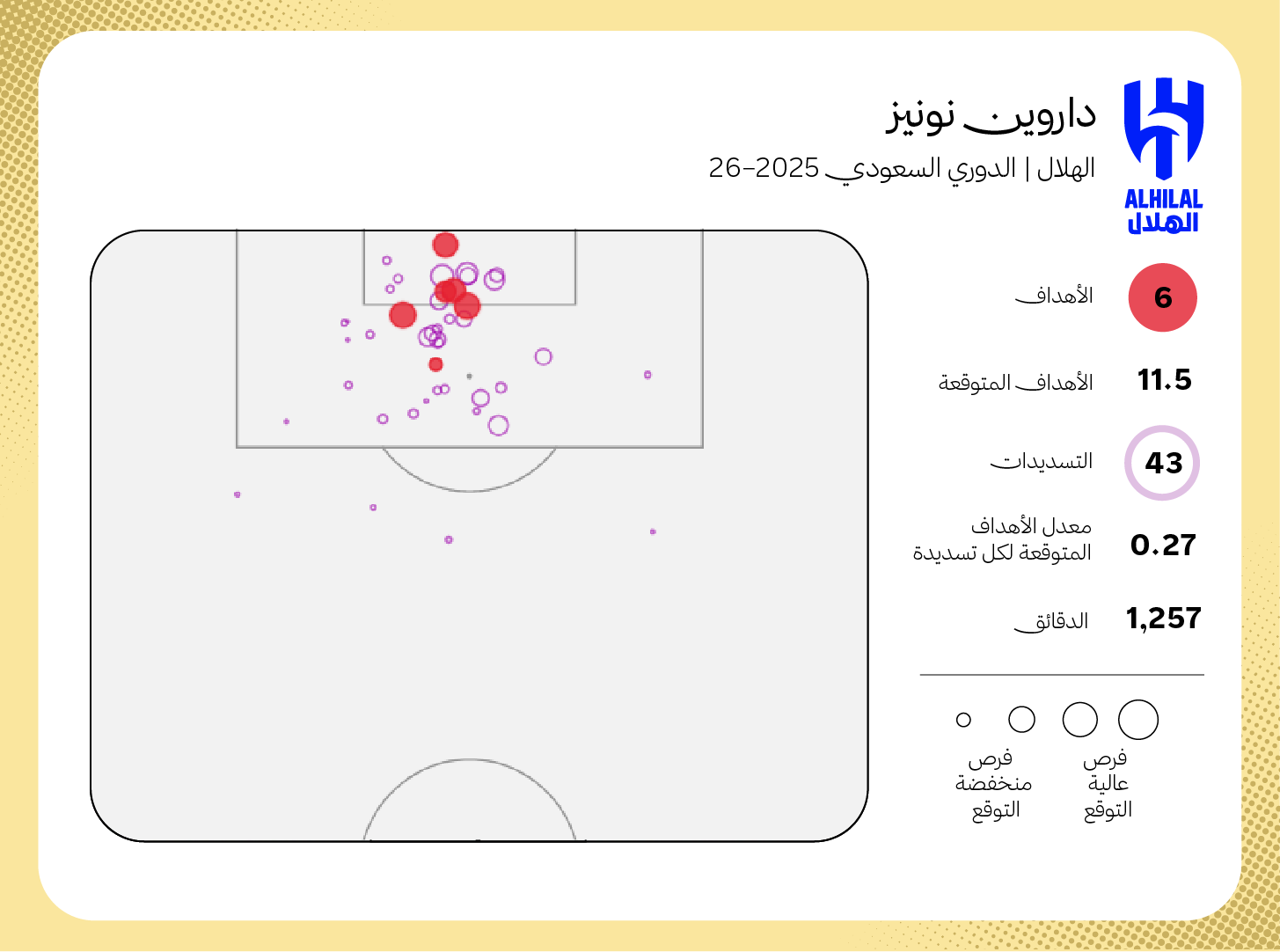 في الموسم الماضي، احتل كريم بنزيما المركز الثالث في ترتيب هدافي الدوري مسجلًا (21 هدفًا من 17.5 هدفًا متوقعًا)، منها (15.5 هدفًا متوقعًا من اللعب المفتوح) ما يعني زيادةً بنحو (5.5 هدف). في حين لعب 29 مباراةً لم يغب عن التسجيل فيها سوى في 11 مباراة. وهو الرقم ذاته الذي يغيب عنه داروين نونيز هذا الموسم!