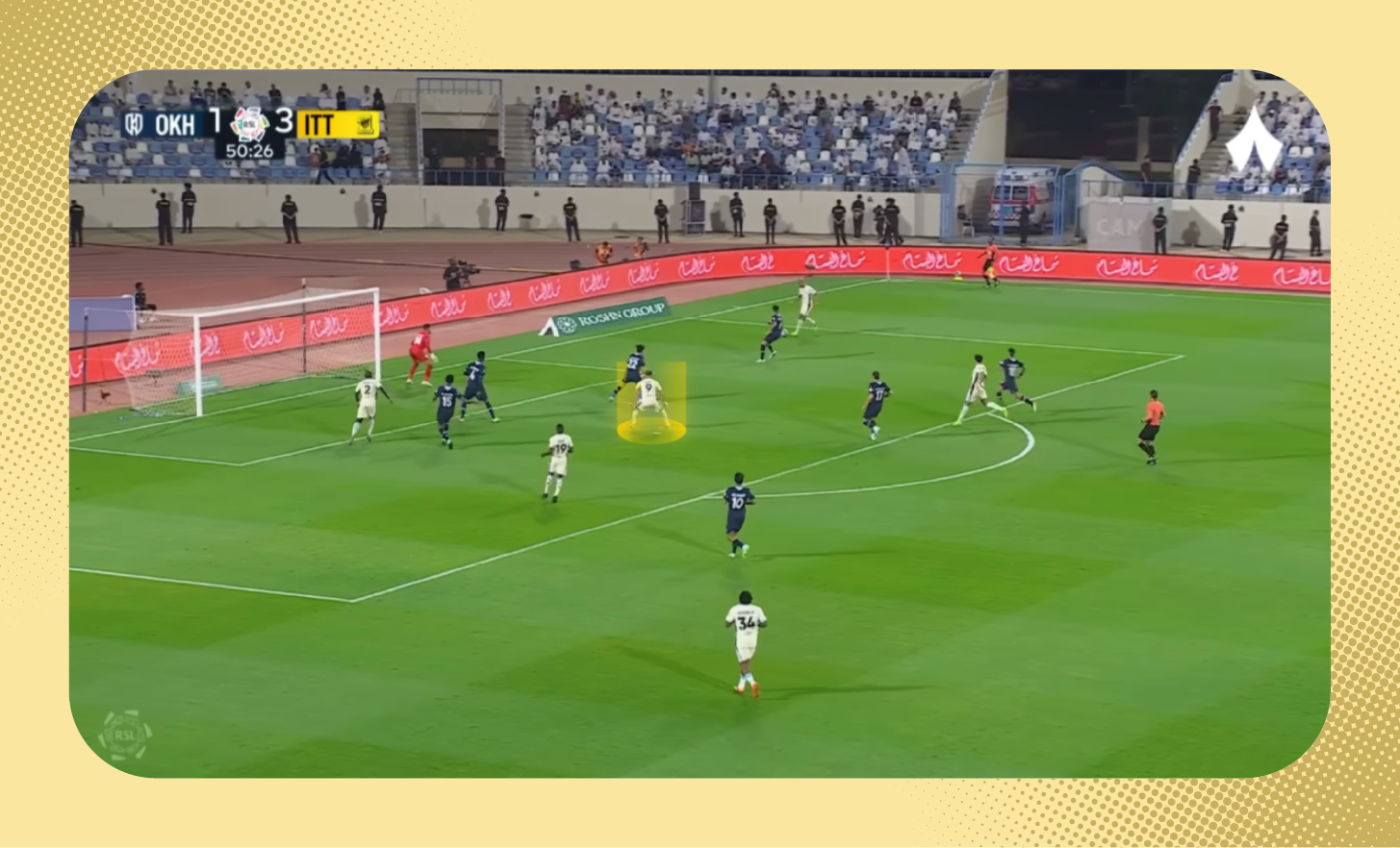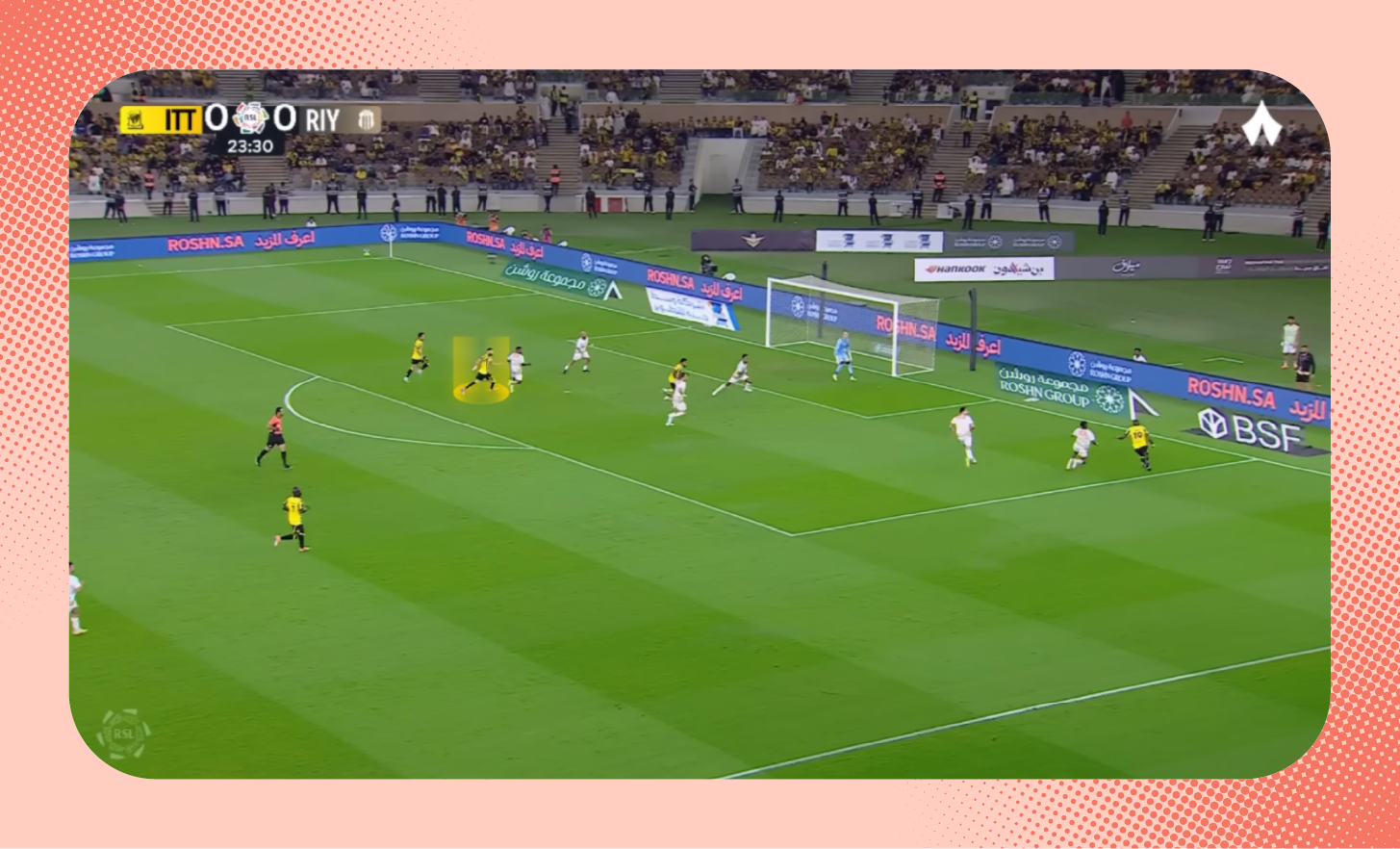 وبالفعل استلم بنزيما الكرة واحتفظ بها رغم ضغط مدافع الاتفاق. وأنتج تحركه هذا كرةً خطِرةً للهلال، لولا أن نيفيز جاء متسلّلًا «شاهد اللقطة بالكامل».