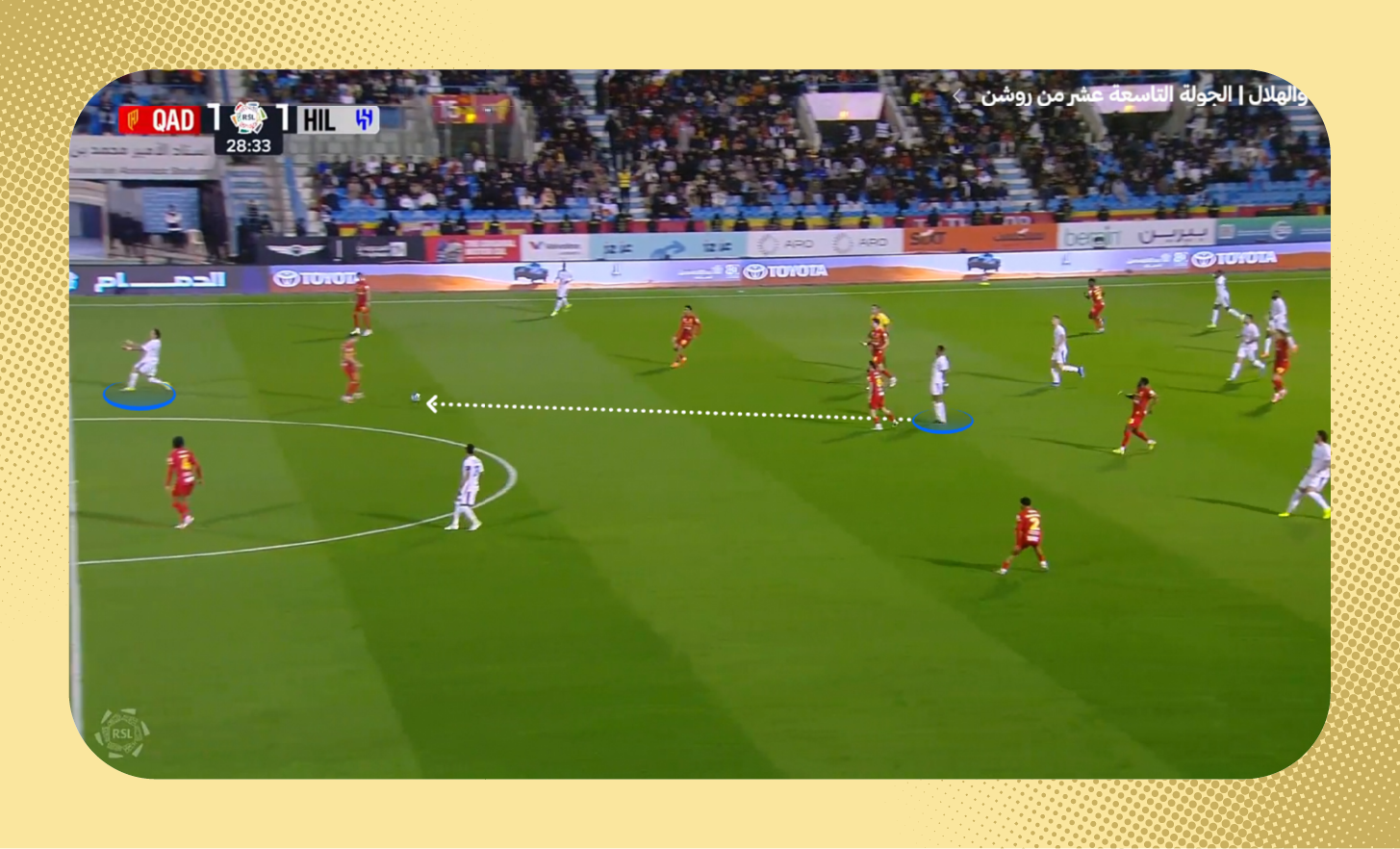 وقبل هدف التعادل أمام القادسية، خلق دارسي ومالكوم مع سافتش تفوقًا عدديًا على الأطراف، ساعد سافتش بالحصول على الكرة في أنصاف المساحات.