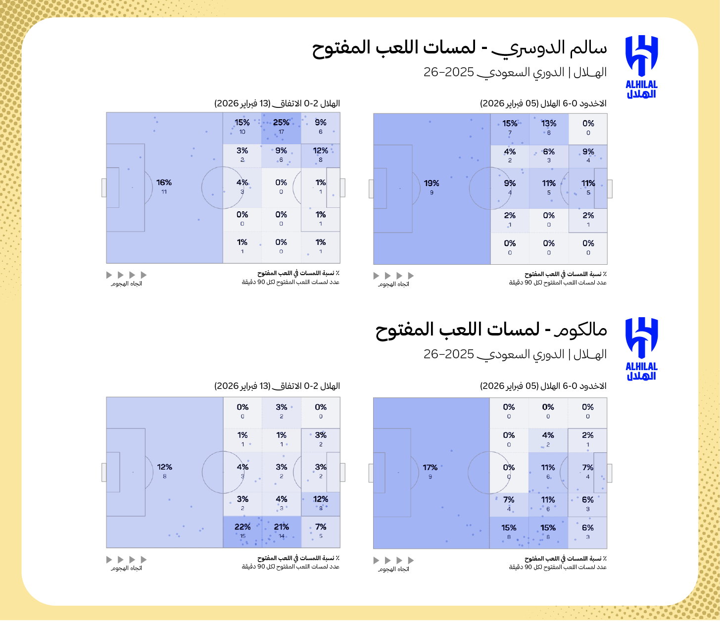 ما يوضّح هذه الميزة هو ارتفاع معدل لمسات سالم الدوسري ومالكوم داخل منطقة الجزاء، فتحولت لمسات سالم الدوسري بوجود بنزيما من (6.77 لمسة إلى 8 لمسات)، ولمالكوم من (4.22 لمسة إلى 9.3 لمسة) بوجود الفرنسي.