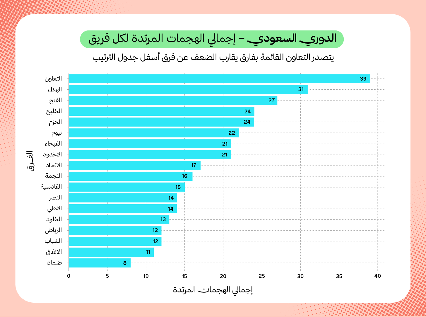 عدد المباريات التي غاب فيها مهاجمو الهلال عن التسجيل مقارنةً بمهاجمي المنافسين على الصدارة: