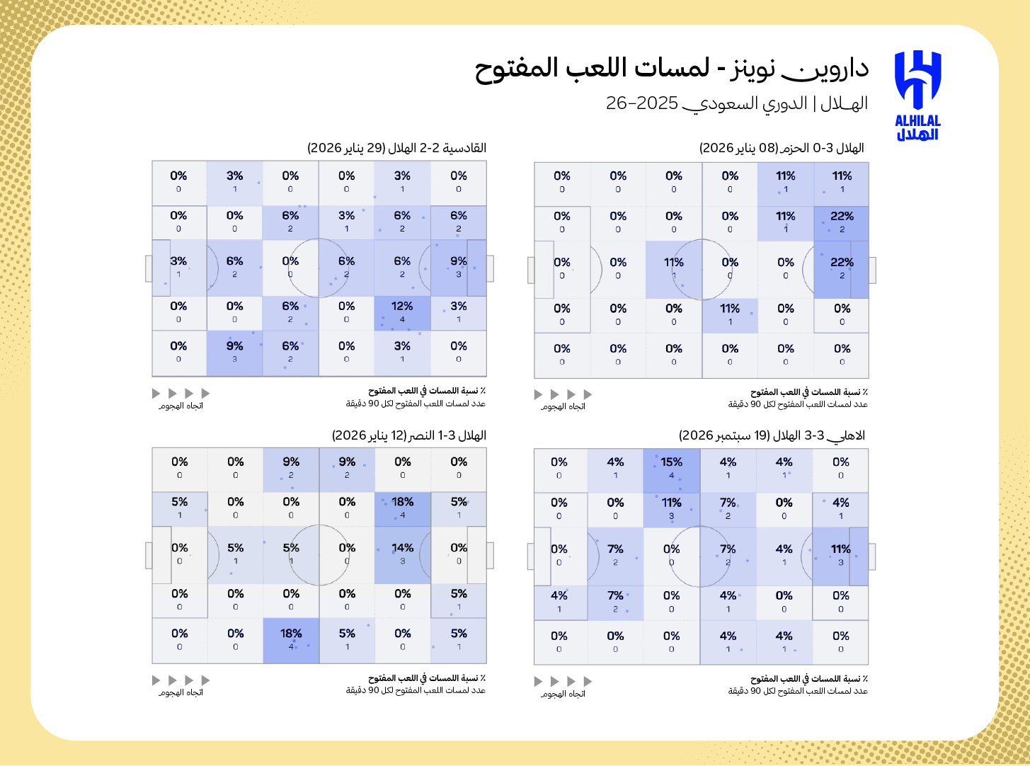 توضّح مجموعة خرائطه الحرارية في المباريات التي لعب بها مهاجمًا رئيسًا، توجّهه الدائم للميل للأطراف أو الحضور أكثر في أنصاف المساحات.