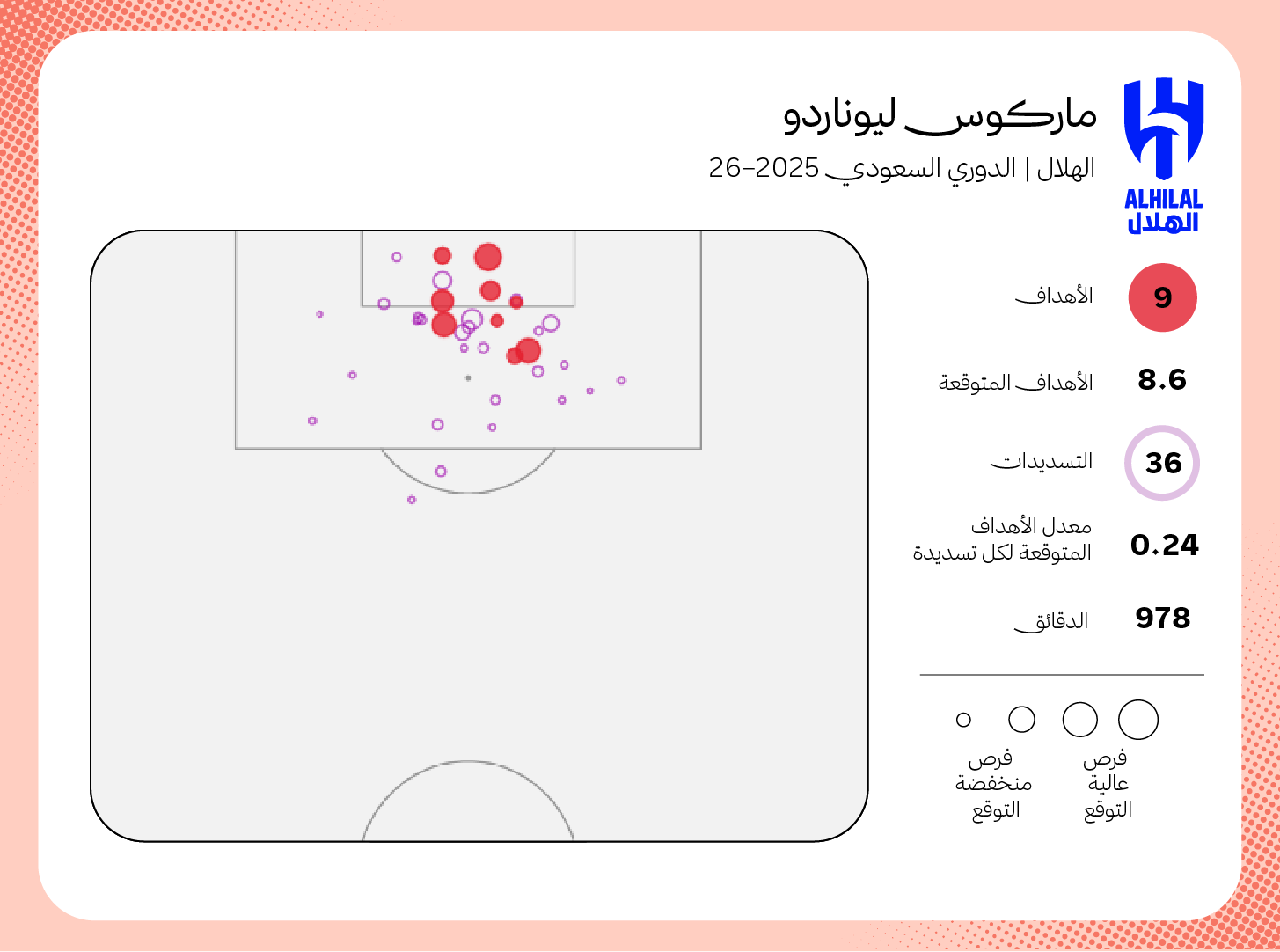 تظهر قيمة ليوناردو عندما ننظر لخريطة أهدافه، حيث استطاع البرازيلي تسجيل (9 أهداف من 8.6 هدف متوقع)، ما يُظهر قدرته الكبيرة على التمركز بشكلٍ صحيح داخل منطقة الجزاء.