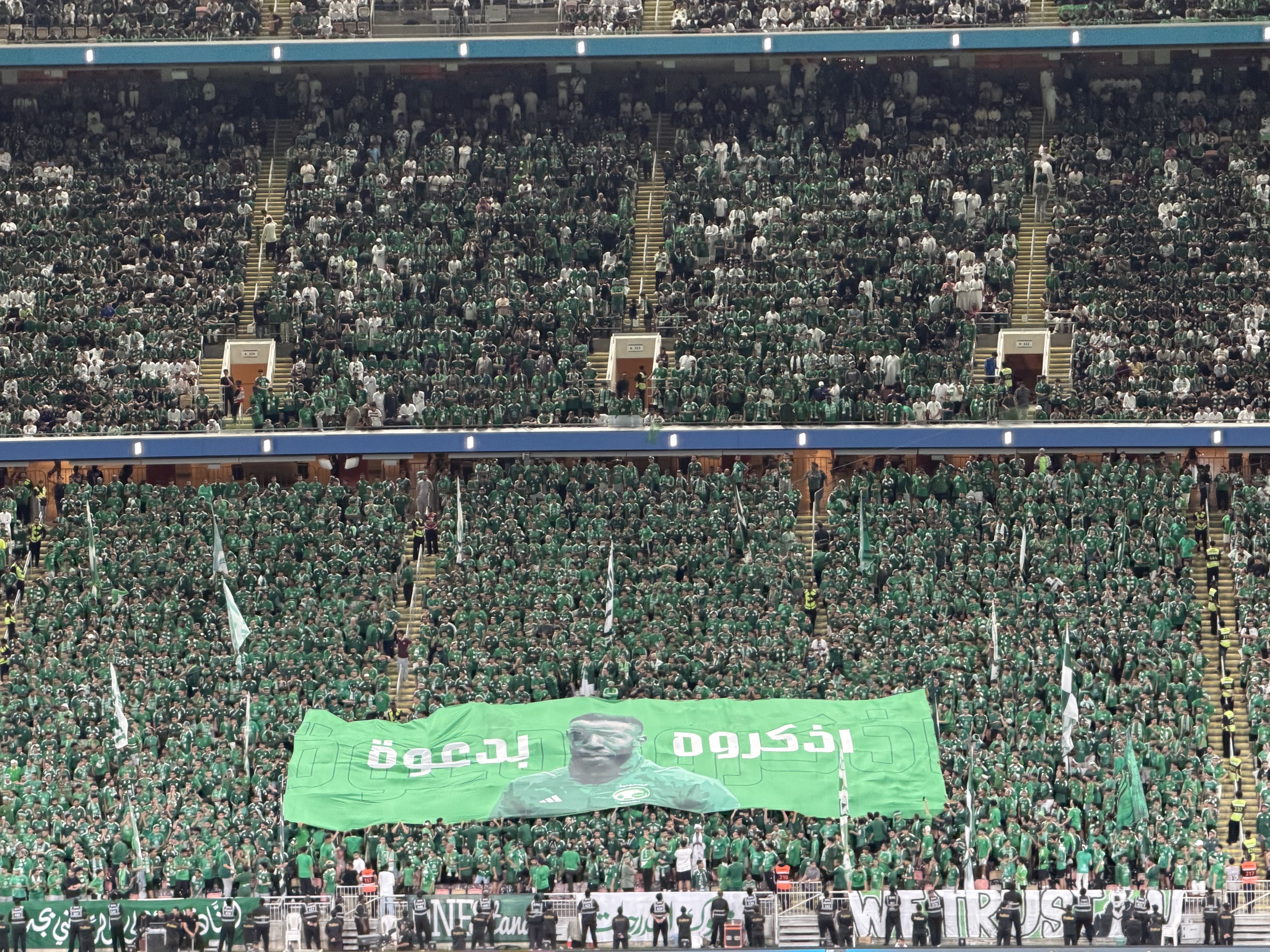 لم يكن الأمر رائعًا فقط داخل الملعب، بل في المدرجات أيضًا. ربما يشير الكثير من الناس إلى التيفو والبنرات، إنما اللفتة الأروع والرسالة الأعظم التي كُتِبت بالتاريخ الرياضي السعودي، هو رفع بنر اللاعب الاتحادي فهد المولد بعبارة «اذكروه بدعوة». فقد ردت جماهير الاتحاد بالتصفيق وهو ردٌّ رائع يسجل إلى الأبد في الذاكرة. هذه هي كرة القدم السعودية والروح الرائعة بين المدرجات وليس ما يحاول البعض ترويجه قبل الديربي وبعده.