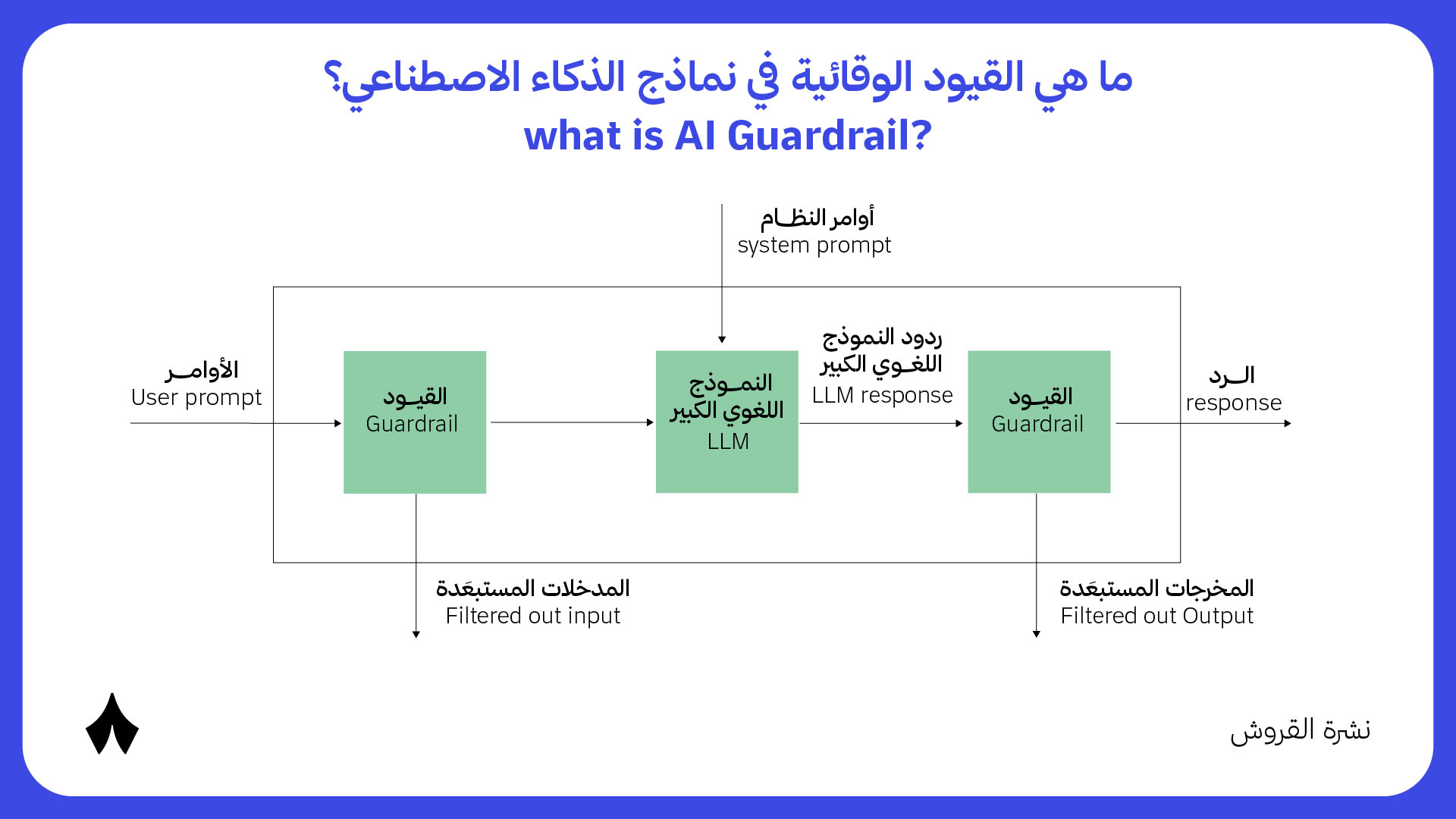 تعريف: هي ضوابط تقنية وتشغيلية وأخلاقية تُفرض على نماذج الذكاء الاصطناعي للتحكم في المدخلات والمخرجات والاستخدامات المسموح بها، بهدف تقليل المخاطر مثل الهلوسة والتسريب والانحياز وسوء الاستخدام، وضمان التزام النموذج بالسياسات التنظيمية والأخلاقية.