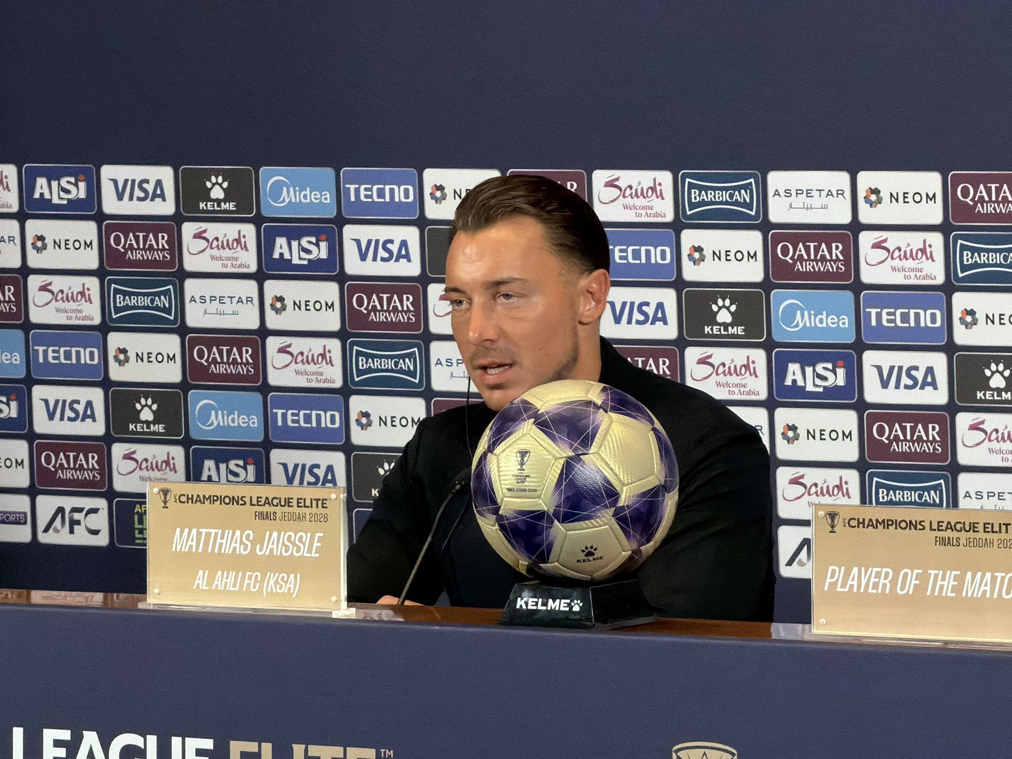يصل يايسله مدرب الأهلي إلى قاعة المؤتمرات الصحفية في ملعب مدينة الملك عبدالله الرياضية، إذ احتفل بشكل كبير بعد إطلاق صافرة النهاية، حيث عبر بالفريق لنصف النهائي الثاني على التوالي، ويأمل بنهائي آخر بالبطولة.