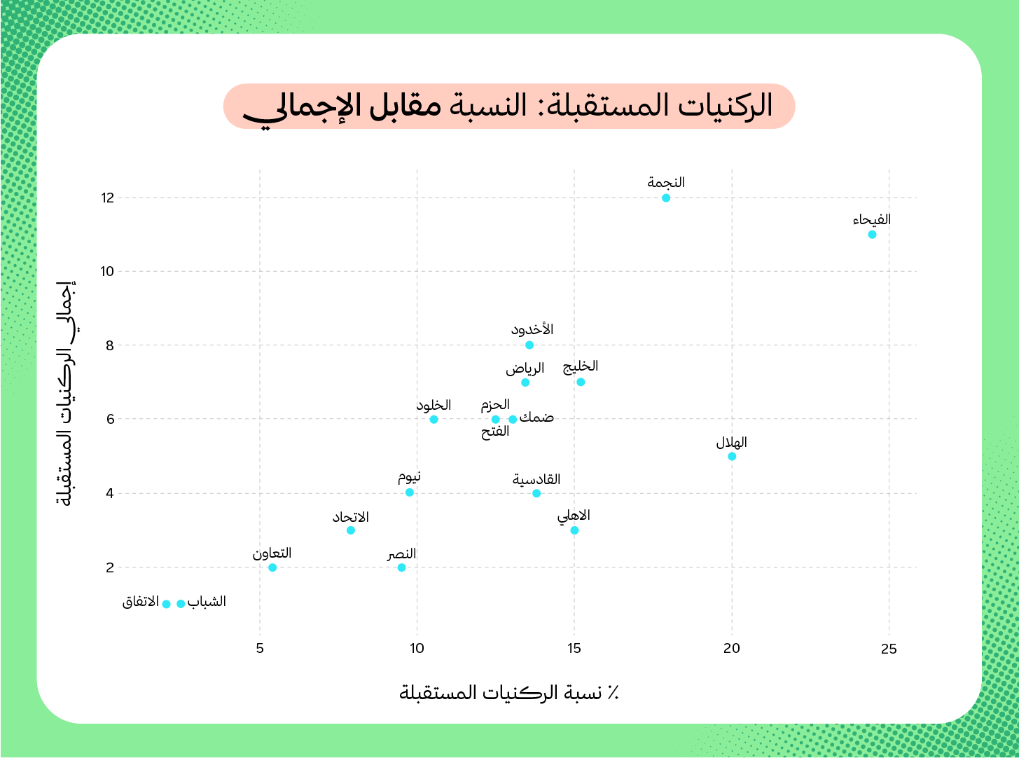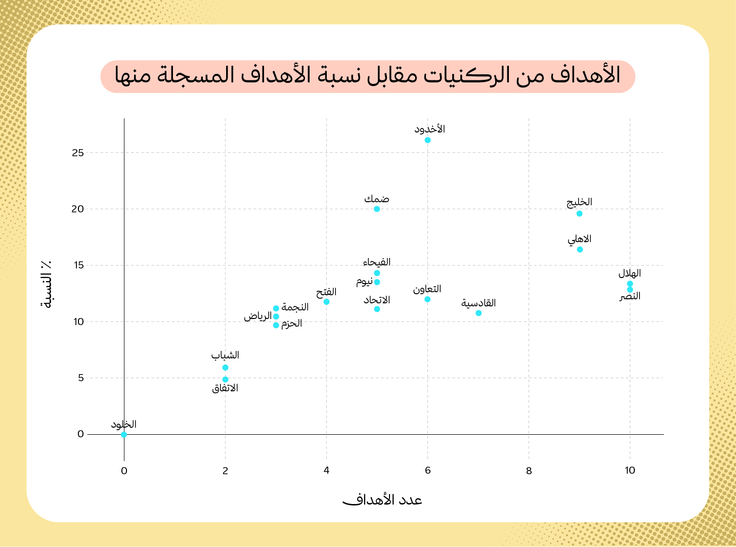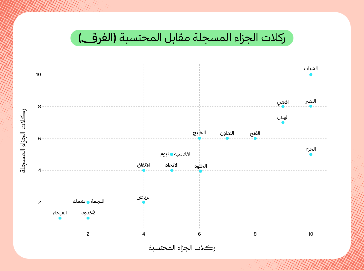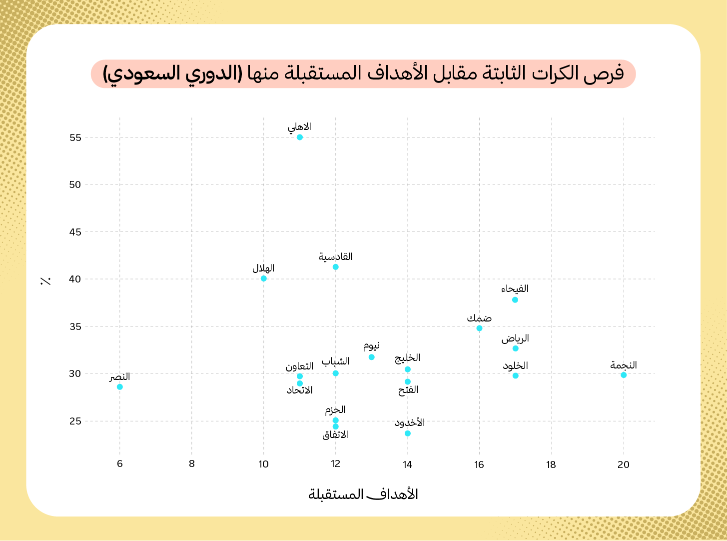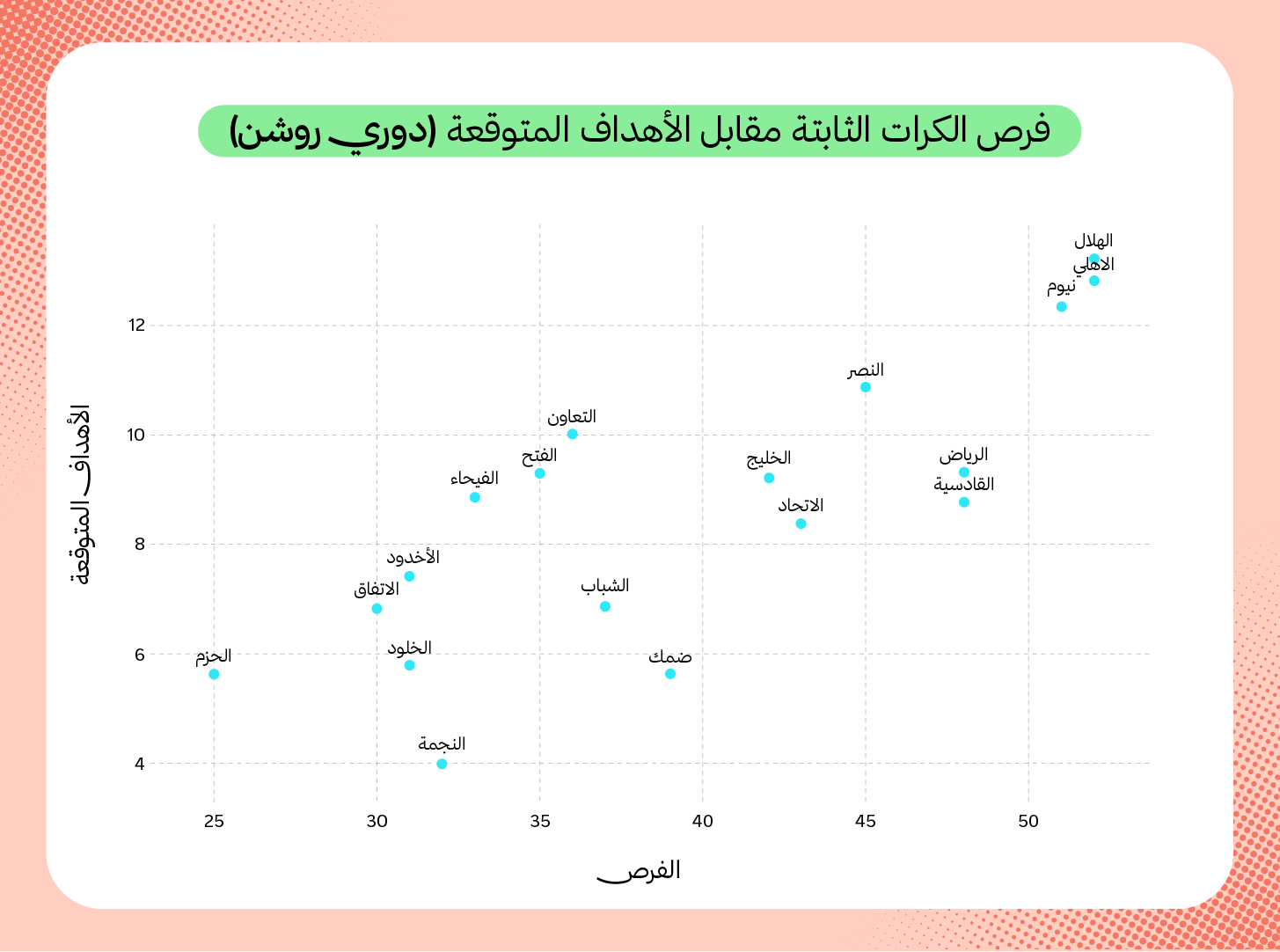 يُظهر الرسم البياني تفوق الهلال ثم الأهلي في تنفيذ الكرات الثابتة، فمع امتلاكهما المعدل الأعلى في خلق الفرص، إلا أن الهلال يتفوق في الأهداف المتوقعة بفارق بسيط عن الأهلي. ثم يأتي نيوم، ويليه النصر، ثم التعاون الذي بالرغم من امتلاكه معدّل فرص أقل يجعله في المرتبة 11 على فرق الدوري، فإنه يتفوق بشكل واضح في الأهداف المتوقعة إذ يحضر خامس الترتيب، ما يعني جودةً عاليةً في التنفيذ رغم قلّة هذه الفرص.