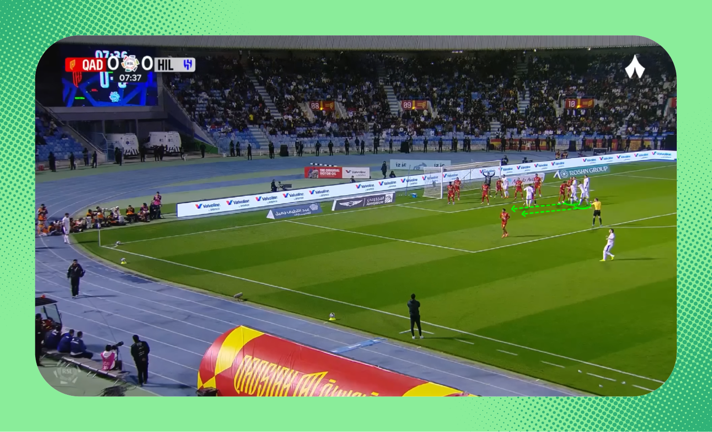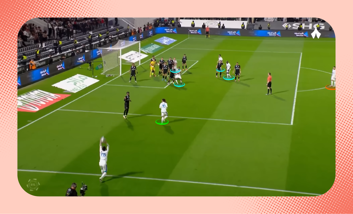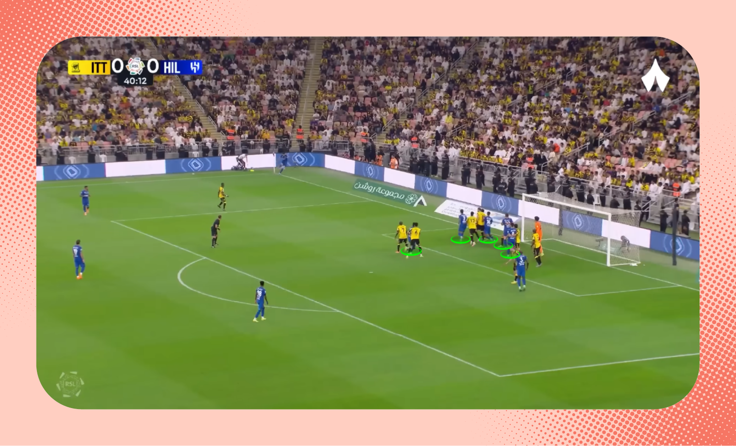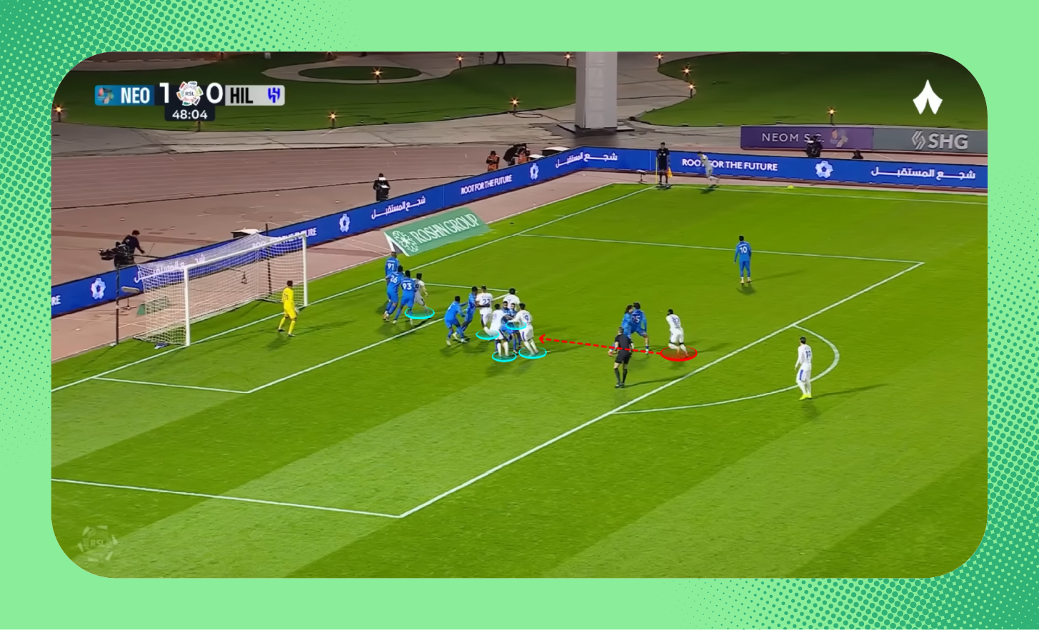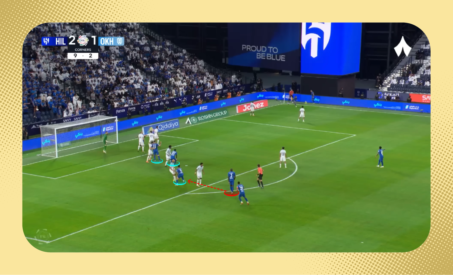 أما في حال كان التنفيذ للداخل (Inswing) فيبحث الهلال عن وضع حارس المرمى وخط الدفاع تحت الضغط؛ من خلال التحرك نحو الزاوية القريبة مع لعب كرة عرضية قوية ومقوسة للداخل تُصعِّب كثيرًا من قدرة الخصم على تفادي تشتيتها دون مشكلة، خصوصًا مع تنفيذ روبن نيفيز البارع لهذه الكرات.