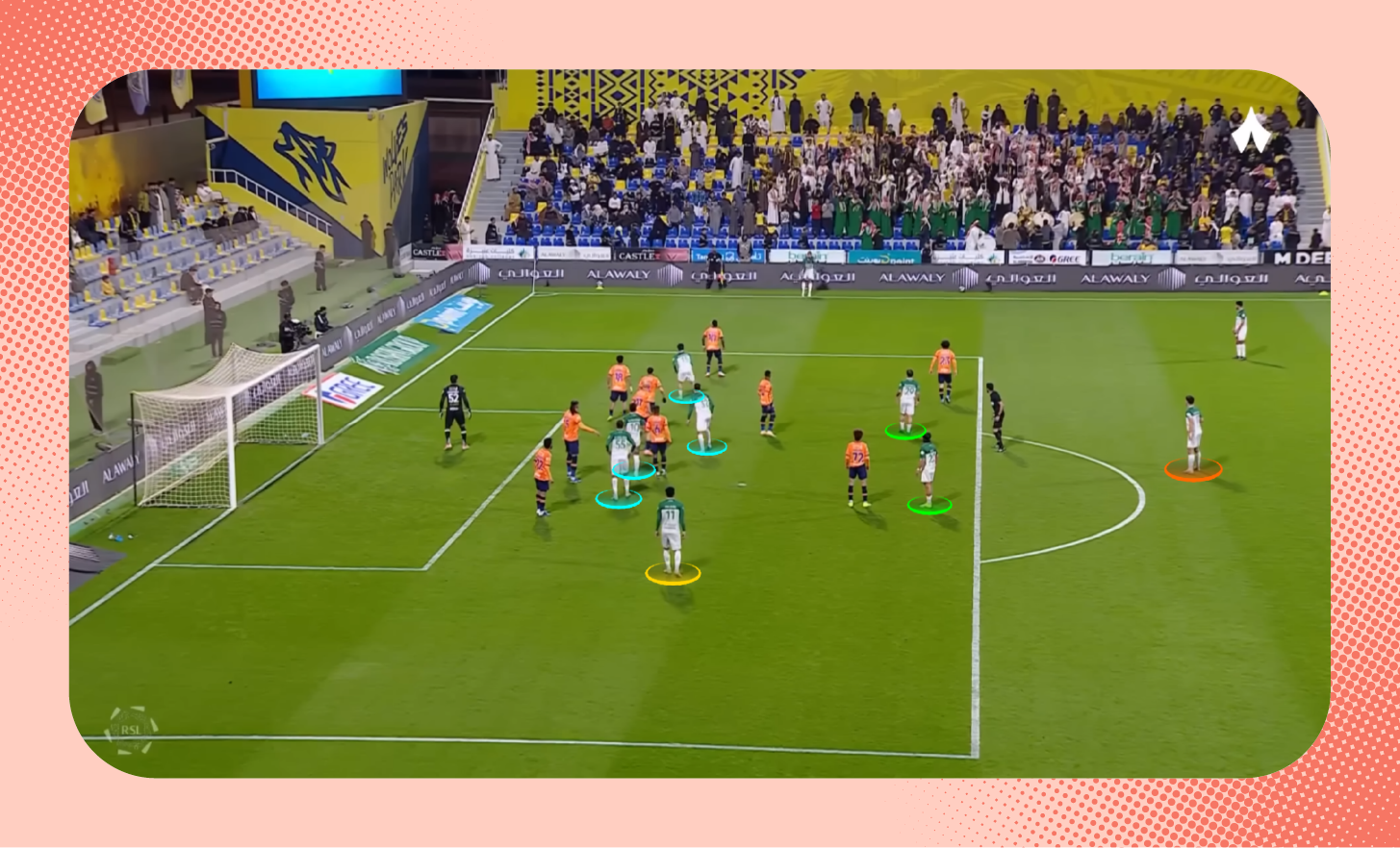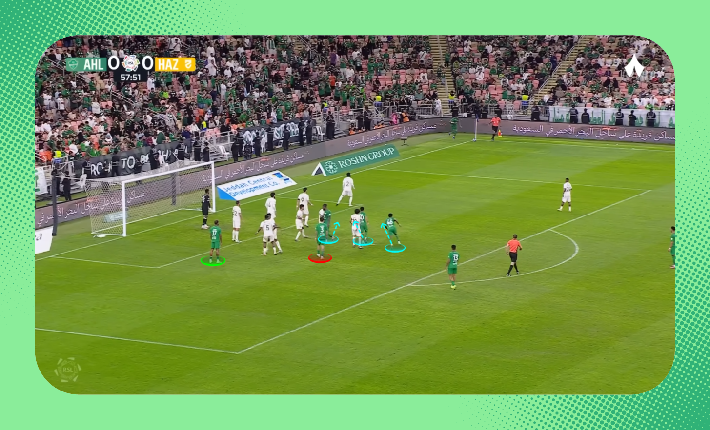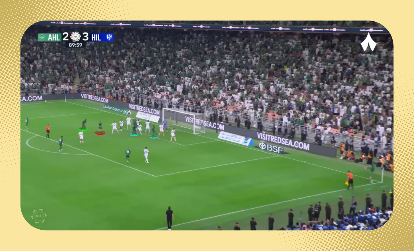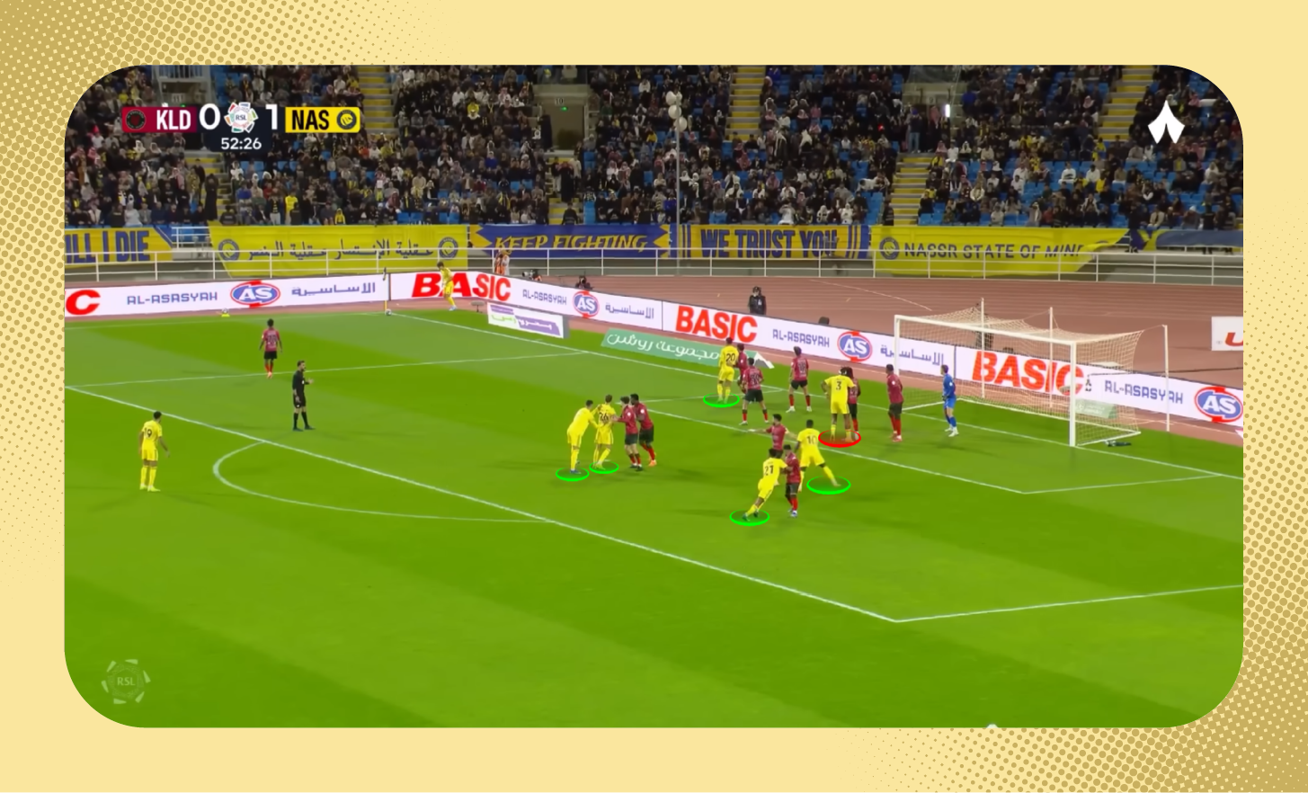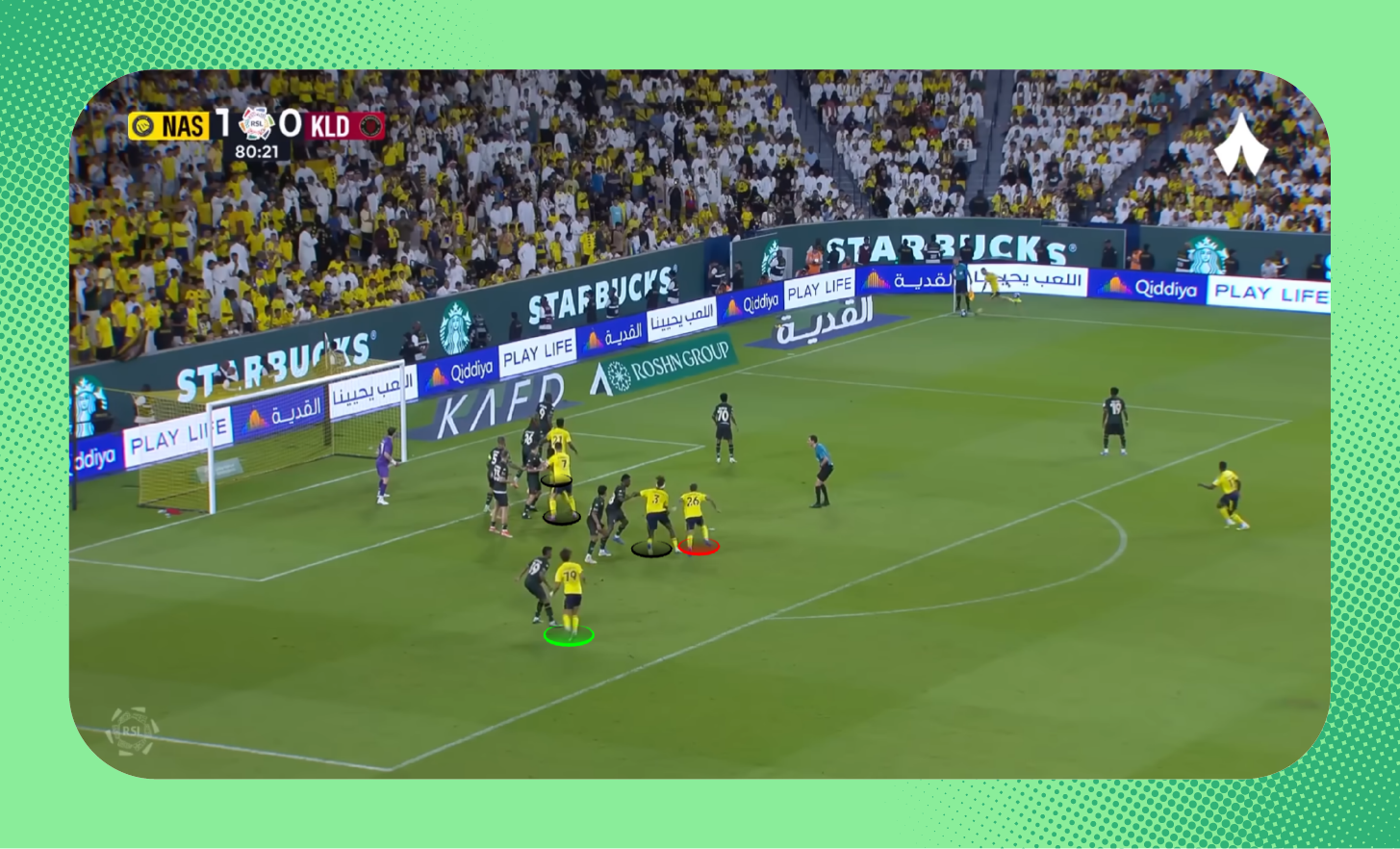 في هذه اللقطة من هدف النصر أمام الأهلي، يمكنك مشاهدة تقسيم اللاعبين حيث إن الأحمر هو اللاعب المستهدَف والأخضر هو المشتت واللاعبون بالعلامة السوداء هم اللاعبون المثبتون «شاهد الهدف».