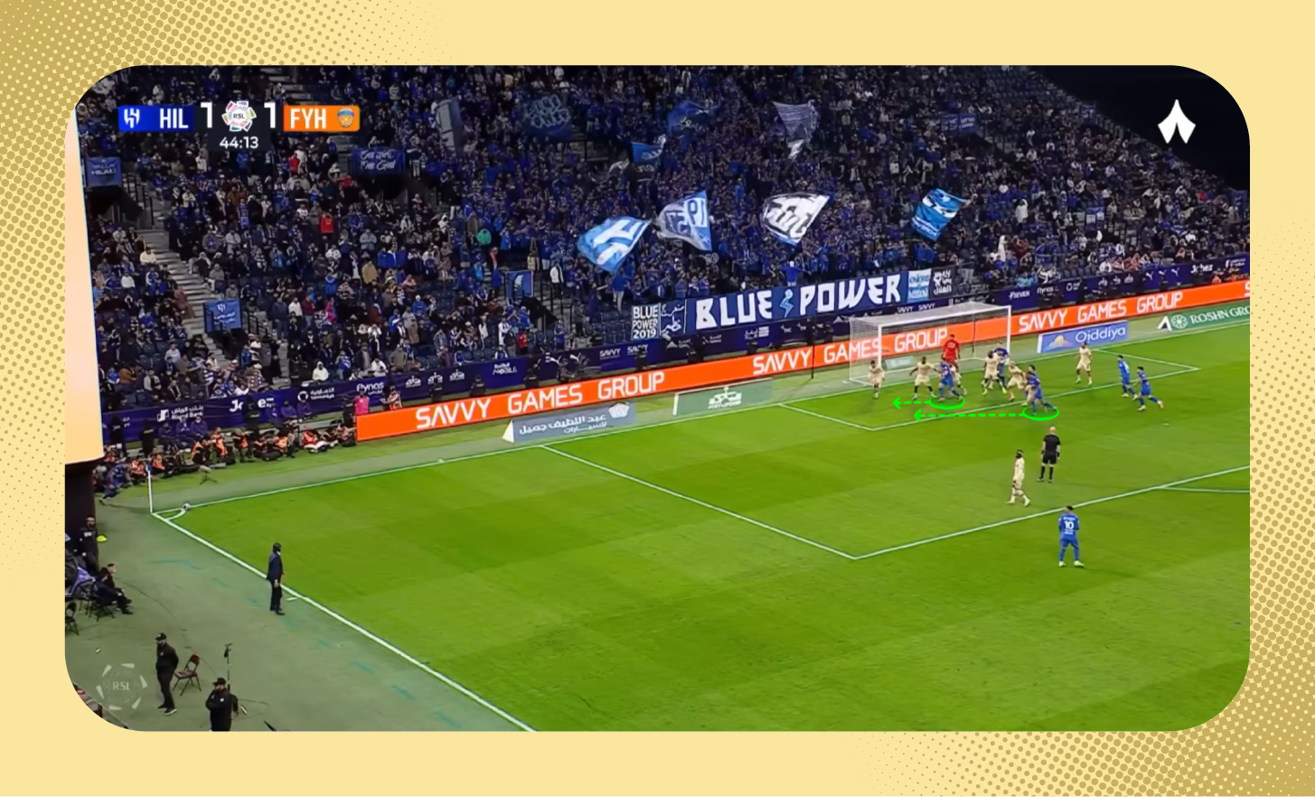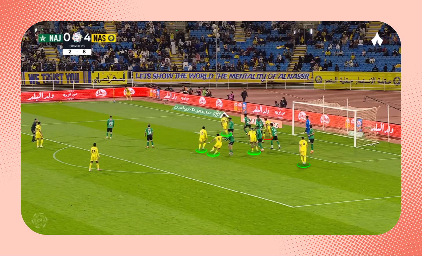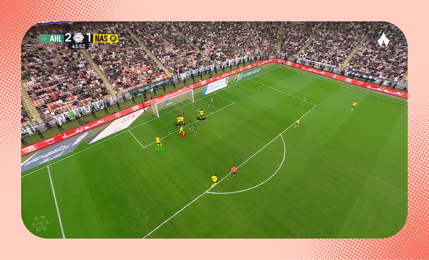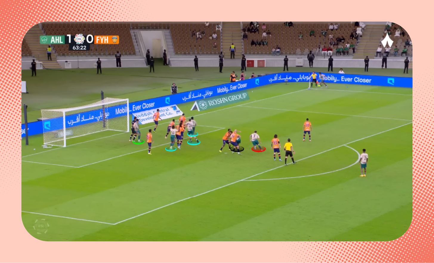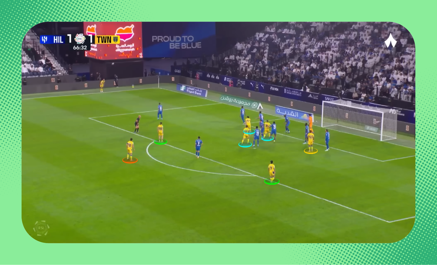 في هذه اللقطة من هدف النصر أمام الأهلي، يمكنك مشاهدة تقسيم اللاعبين حيث إن الأحمر هو اللاعب المستهدَف والأخضر هو المشتت واللاعبون بالعلامة السوداء هم اللاعبون المثبتون «شاهد الهدف».