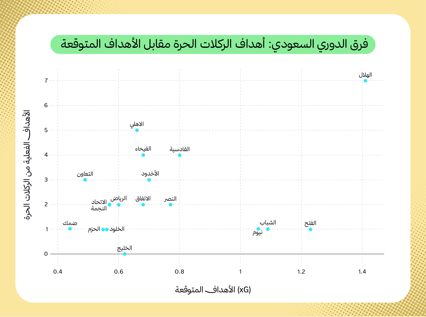 يتصدر الهلال بفارق كبير ترتيب الأعلى في الأهداف المتوقعة من الضربات الحرة بـ1.41 هدفًا متوقعًا، يليه الفتح بـ1.23، ثم الشباب بـ1.09، ثم نيوم بـ1.06. ولكن هذه الفرق الثلاثة جميعها -رغم جودة التنفيذ- لم تسجل سوى هدف واحد فقط.