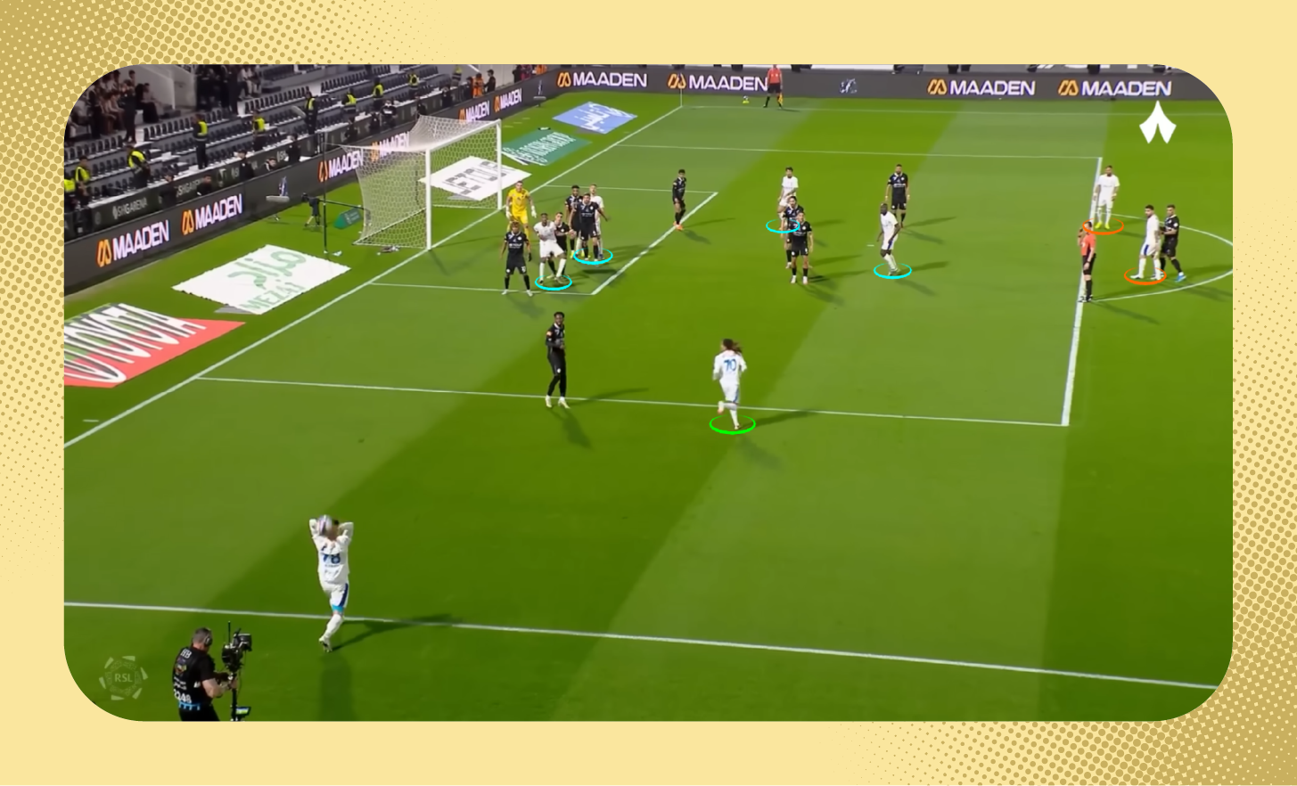 في هذه اللقطة من الهدف الثاني أمام الخلود، يُمكنك ملاحظة وجود سيماكان (اللاعب المستهدَف) في الزاوية القريبة وأمامه أنجيلو، في حين يحاول كومان وماني إضافةً لرونالدو ومارتينيز التحرك، وكأن الكرة تستهدف أحدهم ولكن الكرة في الأصل متوجهة لسيماكان «شاهد الهدف».