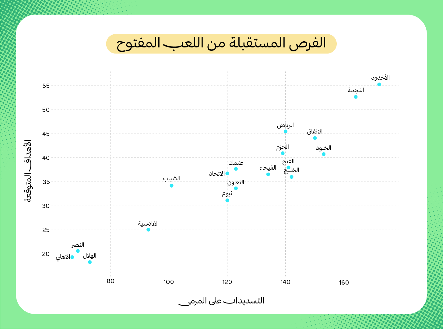 فعندما نرى الرسم البياني الخاص بعدد الفرص والأهداف المتوقعة المُستقبلة من اللعب المفتوح، سنجد تفوقًا واضحًا للفرق الأربعة الأولى على ترتيب الدوري. مع أفضلية واضحة للأهلي والنصر والهلال، وهو الأمر الذي يوضّح جودة هذه الفرق دفاعيًا، ولكن عندما ننظر للفرص المستقبلة من الكرات الثابتة، سنجد معاناة الأهلي والهلال والقادسية الواضحة في الدفاع ضدها، إذ فقدوا بسبب ذلك الكثير من النقاط حتى الآن خصوصًا الهلال والأهلي.
