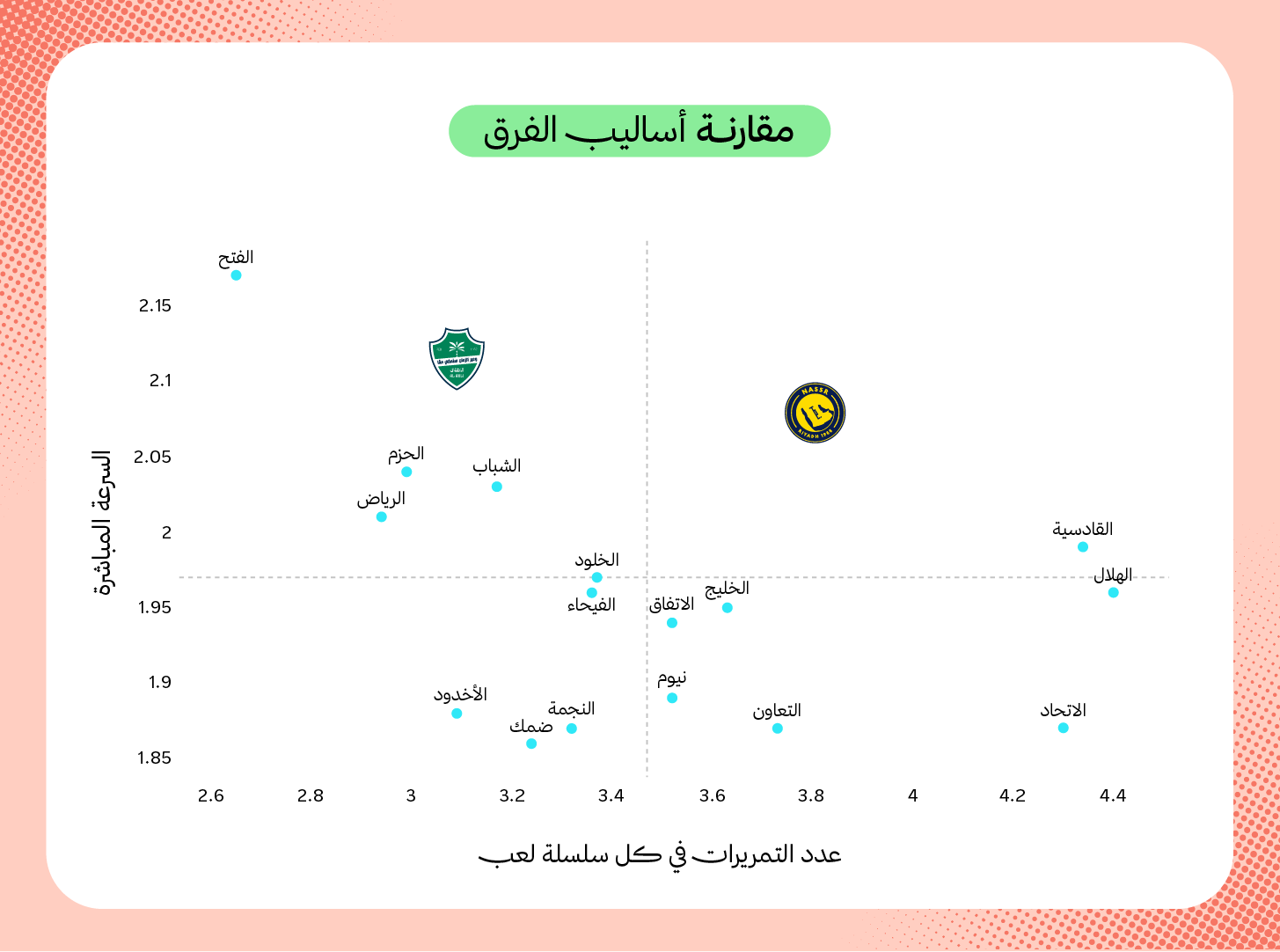 في المقابل، يعتمد النصر أيضًا على الهجوم المباشر ويأتي ثالثًا بعد الأهلي بمعدل (2.08 متر/ثانية)، ولكنه يتمتع بمعدل سلاسل تمريرات أعلى يقترب من (3.8 تمريرة/لكل سلسلة) ونسبة استحواذ 59.6%، تجعله ثالث أعلى فرق الدوري في نسبة الاستحواذ بعد القادسية والاتحاد.
