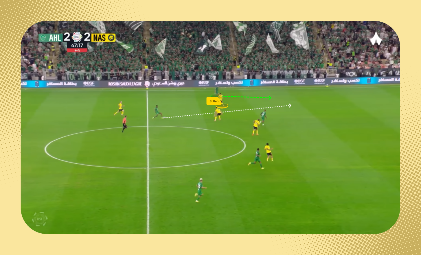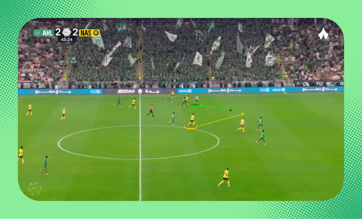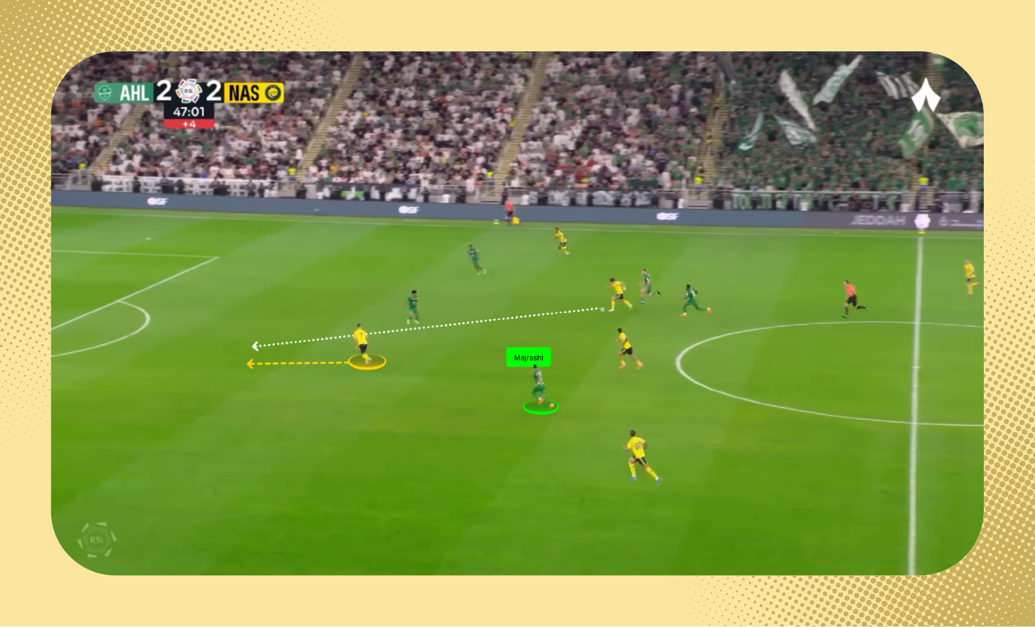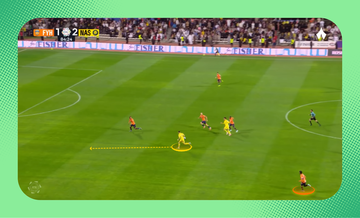 ظهرت المشكلة ذاتها في مباراة الذهاب بين الفريقين، عندما حصل النصر على الكرة وانطلق بها جواو فيلكس؛ ليمرر الكرة لرونالدو مع ملاحظة المسافة بينه وبين مجرشي.