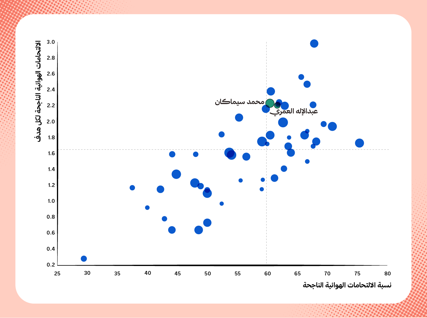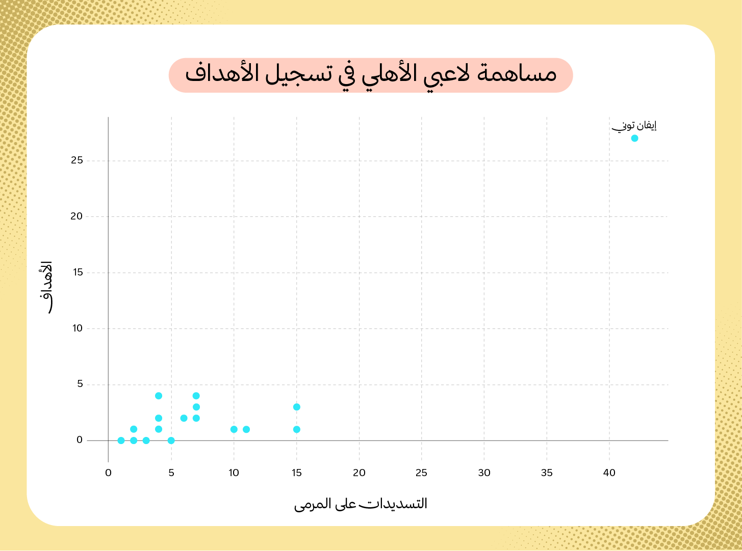 يُظهر الرسم البياني حجم الاعتماد الكبير على إيفان توني من الناحية التهديفية، فقد سجل المهاجم الإنقليزي ما يقارب 52% من أهداف الأهلي في الدوري هذا الموسم، إضافةً إلى أنه كان مسؤولًا عن تسديد 29% من إجمالي تسديدات الفريق.