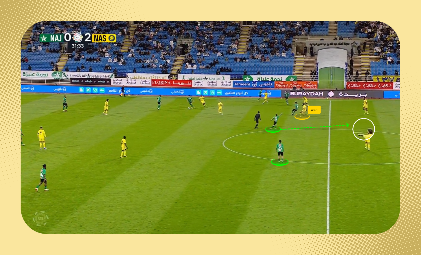 في هذه اللقطة من مباراة النجمة، يُمكنك مشاهدة إشارة مارتينيز للعمري لمحاولة ثنيه عن التقدم المبالغ فيه نحو لاعبٍ كان من المفترض أن يكون لمحمد سيماكان، في الوقت الذي يحضر فيه اللاعب الذي من المفترض أن يكون مسؤولية العمري حرًّا في عمق الملعب. ما ترك مارتينيز في مواجهة (2 ضد 1)، ولكن لم يستفد منها النجمة.
