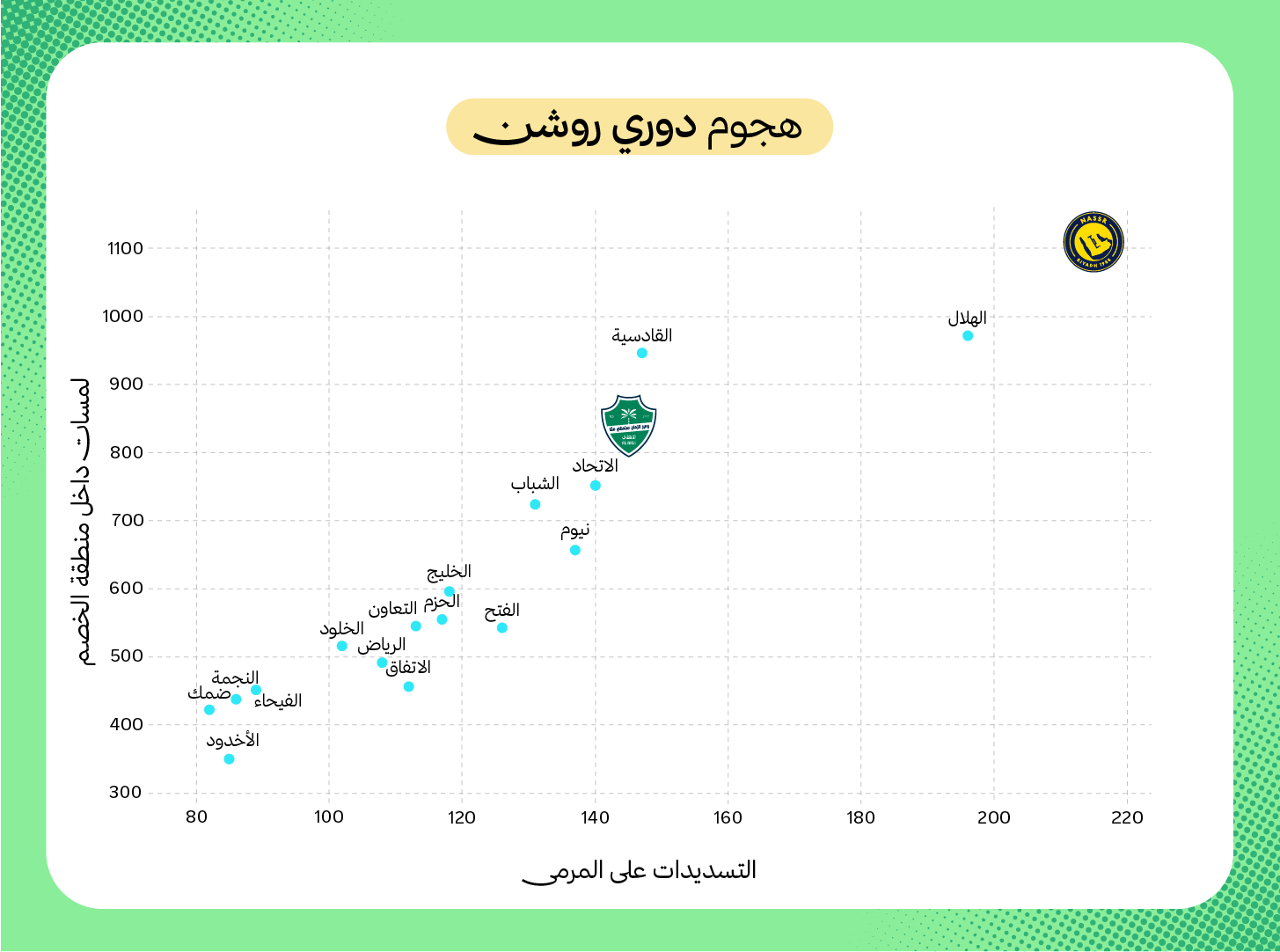 إضافةً لذلك، إن النصر أكثر الفرق تسديدًا على المرمى بـ 215 تسديدة، وهو الفريق الوحيد الذي تجاوزت تسديداته حاجز الـ200 تسديدة. في حين أن الأهلي سدد 145 تسديدةً تضعه رابعًا في الترتيب بعد النصر والهلال والقادسية. كما أن النصر الفريق الوحيد الذي تجاوزت لمساته للكرة داخل منطقة الخصم حاجز الألف لمسة (1101 لمسة)، مقابل 802 لمسة للأهلي داخل منطقة جزاء الخصم.