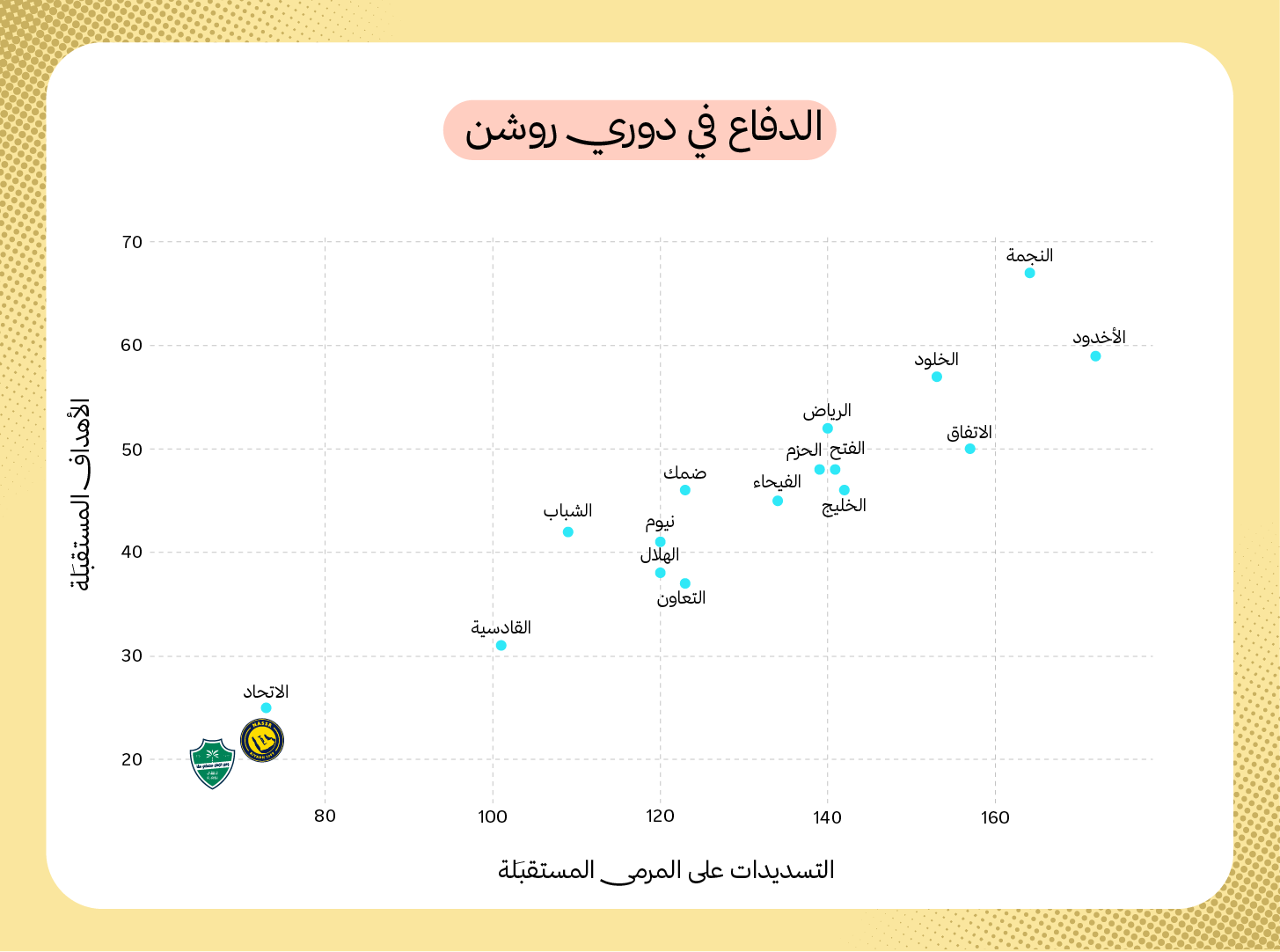 فمنذ الخسارة أمام الهلال، تلقت شباك الفريق 6 أهداف فقط في 15 مباراة، ولم يستقبل أكثر من 4 تسديدات على مرماه، سوى في مباراتين. ولكن المفارقة هنا أن المباراتين اللتين استقبل فيهما 4 تسديدات كانتا مباراتي الفتح في الجولة 22 والنجمة في الجولة 27، والقاسم المشترك بينهما هو افتقاد الفريق فيهما للظهير الأفضل في الجانب الدفاعي.