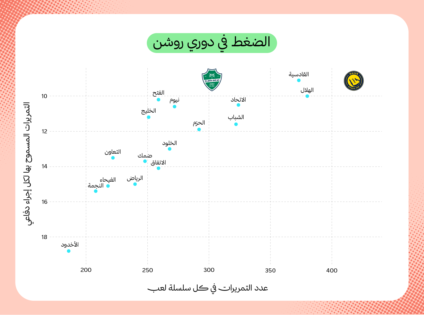 في المقابل، يتمتع الأهلي بثاني أفضل معدل في التمريرات المسموح بها قبل الإجراء الدفاعي بـ 9.2 تمريرة فقط. يليه النصر في المركز الثالث، الذي يسمح للخصم بـ 9.3 تمريرة، كما يتمتع النصر بثالث أعلى معدل في استعادة الكرة في الثلث الأخير من الملعب بـ (5.5)، فيما يستعيد الأهلي الكرة في الثلث الأخير بمعدل (4.3).