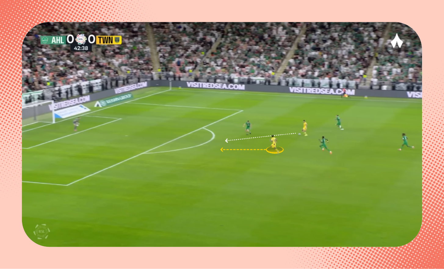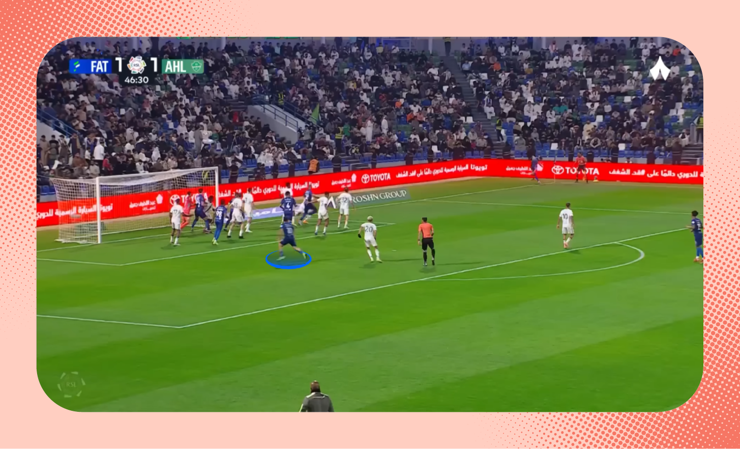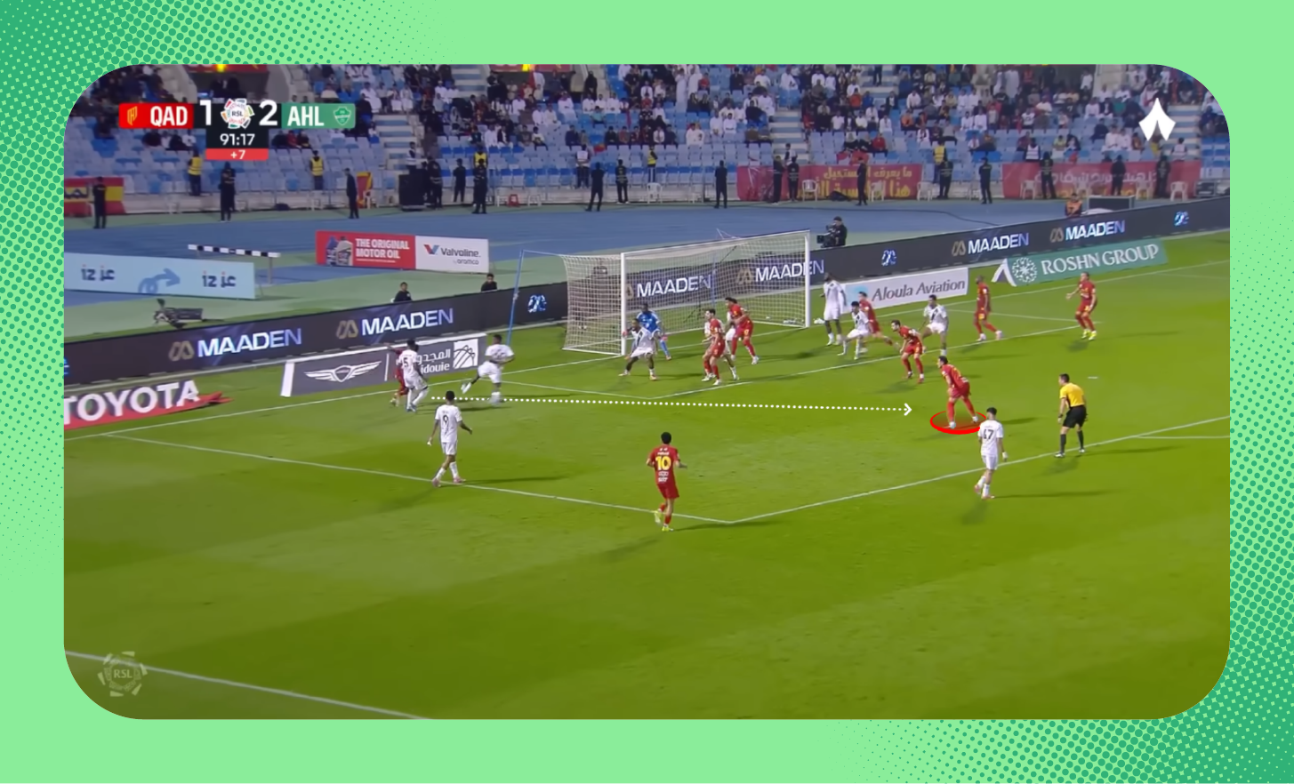 حدث الأمر ذاته في هدف القادسية، إذ استطاع تركي العمار تفريغ نفسه بشكل جيد بعيدًا عن لاعبي الأهلي، ولاحظ التكتل داخل منطقة الستة ياردة «شاهد الهدف».